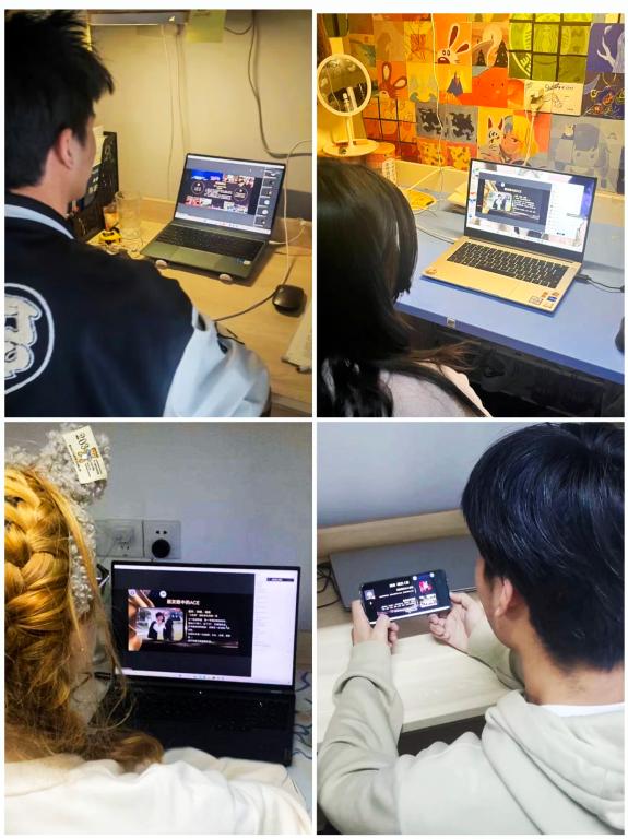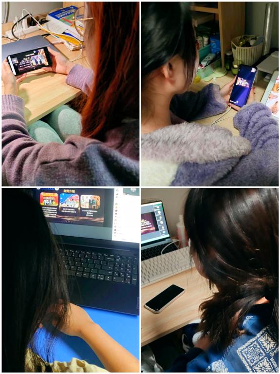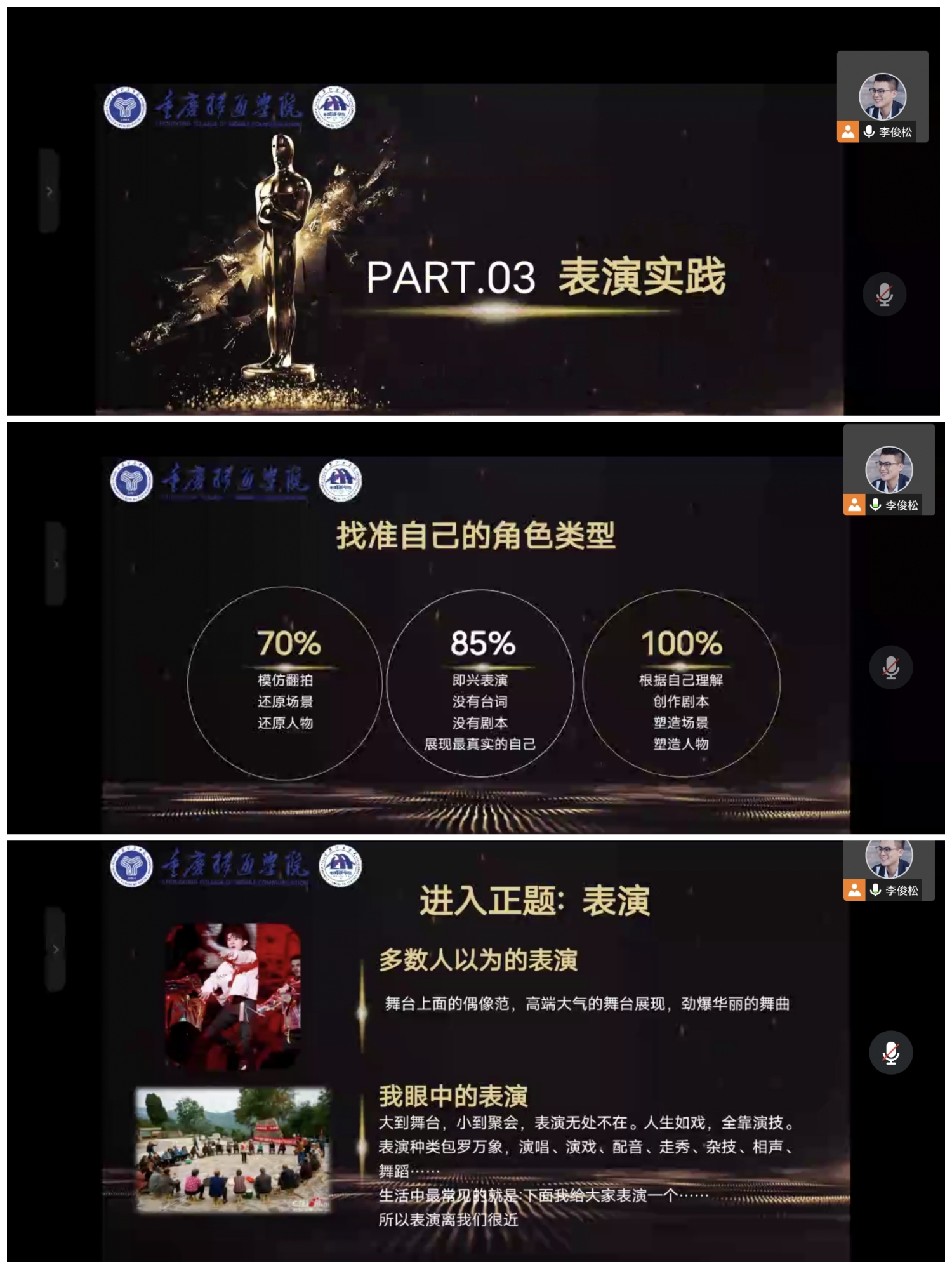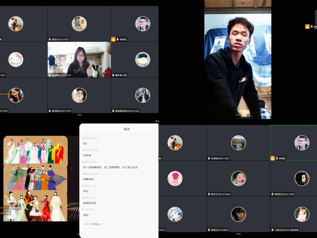 接着李俊松学长通过自身对表演的理解提出了戏剧表演最重要的是角色,而角色是通过模仿和塑造表现出来的。他以自身翻拍《左耳》的经历体现其模仿的重要性,通过模仿从而也找到了适合属于自己的风格。然后李俊松学长也同我们分享了模仿翻拍、即兴表演、自我理解三种不同角色类型,让同学们找准自己的角色定位,增加对表演的兴趣。他现场模仿了《黑白禁区》里演员欧豪饰演的精彩片段,无论是表情神态,肢体动作还是台词功底,他的演绎都十分生动传神,与原视频无二致。同时他鼓励同学们打开摄像头,放下“包袱”切身去体会表演的魅力,也对一些演戏技巧还不成熟的同学提出自己的建议和指导。