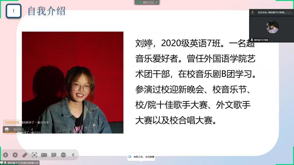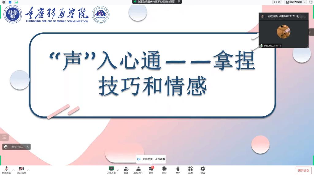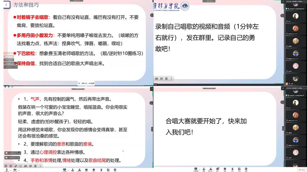 “会唱歌的人不一定会用技巧,但是会用技巧的人就能唱好歌。”刘婷学姐告诉我们这样的道理。声乐是需要掌握许多方法和技巧的,唱好歌要对着镜子唱、会用丹田发力、让下巴放松以及自信。刘婷学姐通过线上视频连麦的方式为我们讲解了唱歌的四个方法和技巧,也给每一位连麦的同学进行指导和矫正。