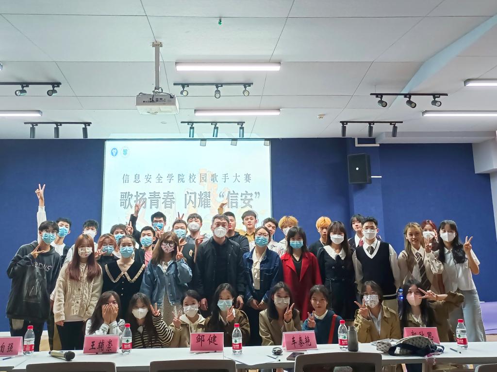 活动结束后,各位评委老师与参赛选手合影留恋;信息安全学院辅导员温朝一老师对此次活动做了最后的总结,表达了对“歌扬青春,闪耀‘信安’”活动完满完成的肯定,同时工作人员们也从中汲取宝贵的经验,完善自我,充分提升了高效有序开展更多活动的能力。