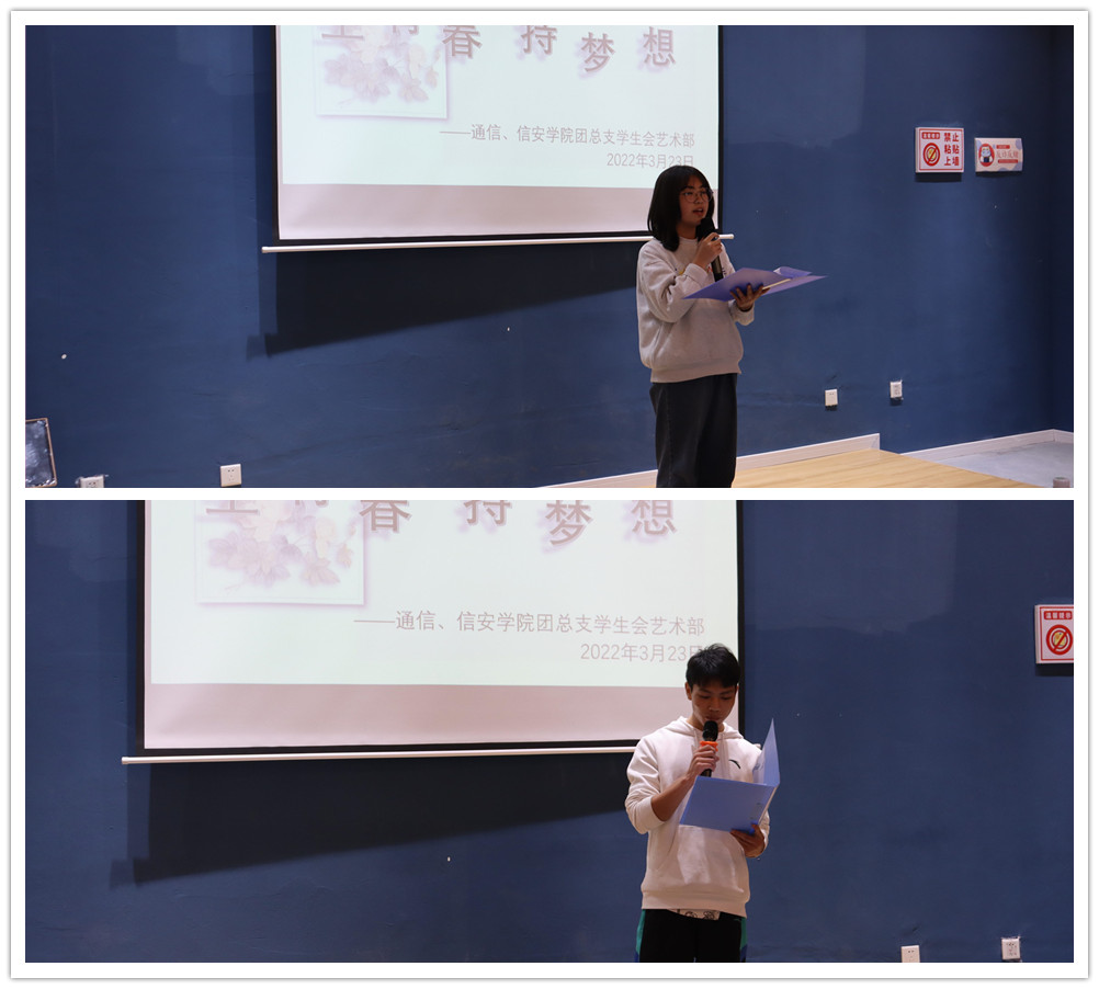 为提升大学生综合素质,丰富同学们的课余生活,培养同学们对主持的兴趣,推动我校精神文明建设,2022年3月23日下午4点,通信、信安学院于綦河书院故事茶馆举办了以“主青春,持梦想”为主题的第十四届校园主持人大赛学院选拔赛。在经过前期的自主报名和辅导员推荐,共有20名同学参加此次选拔赛决赛。本次比赛参赛选手围绕三个部分进行展示,分别是:1分钟的自我介绍、主持稿表演、绕口令,最终由评委们打分选出最优选手代表学院参加校级比赛。