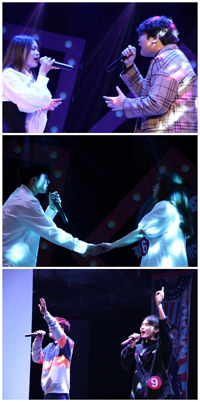 是对手,也是队友 比赛进行到第二轮,台下的同学热情高涨,为选手们呐喊加油,台上的选手们也摩拳擦掌,激情满满。对唱结束后,最终评委评分靠前的:田明月、陈天其、廖大凯、樊龙温四位同学进入到最终的争夺战。他们在今晚将自己的热情与自信完全交付于这个舞台,一字一句演唱的是放飞艺术梦想的憧憬,更是生活中值得记忆的点点滴滴。