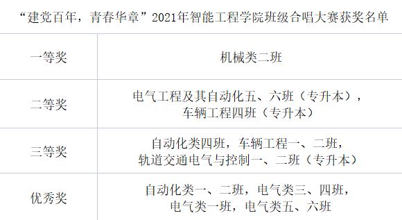 最后,经各评委严格打分,2021级机械类二班获得本次班级合唱大赛一等奖,电气工程及其自动化五六班(专升本)、车辆工程(专升本)获得二等奖,自动化类四班、车辆工程一二班、轨道交通电气与控制一二班(专升本)获得三等奖,其余班级获得优秀奖。