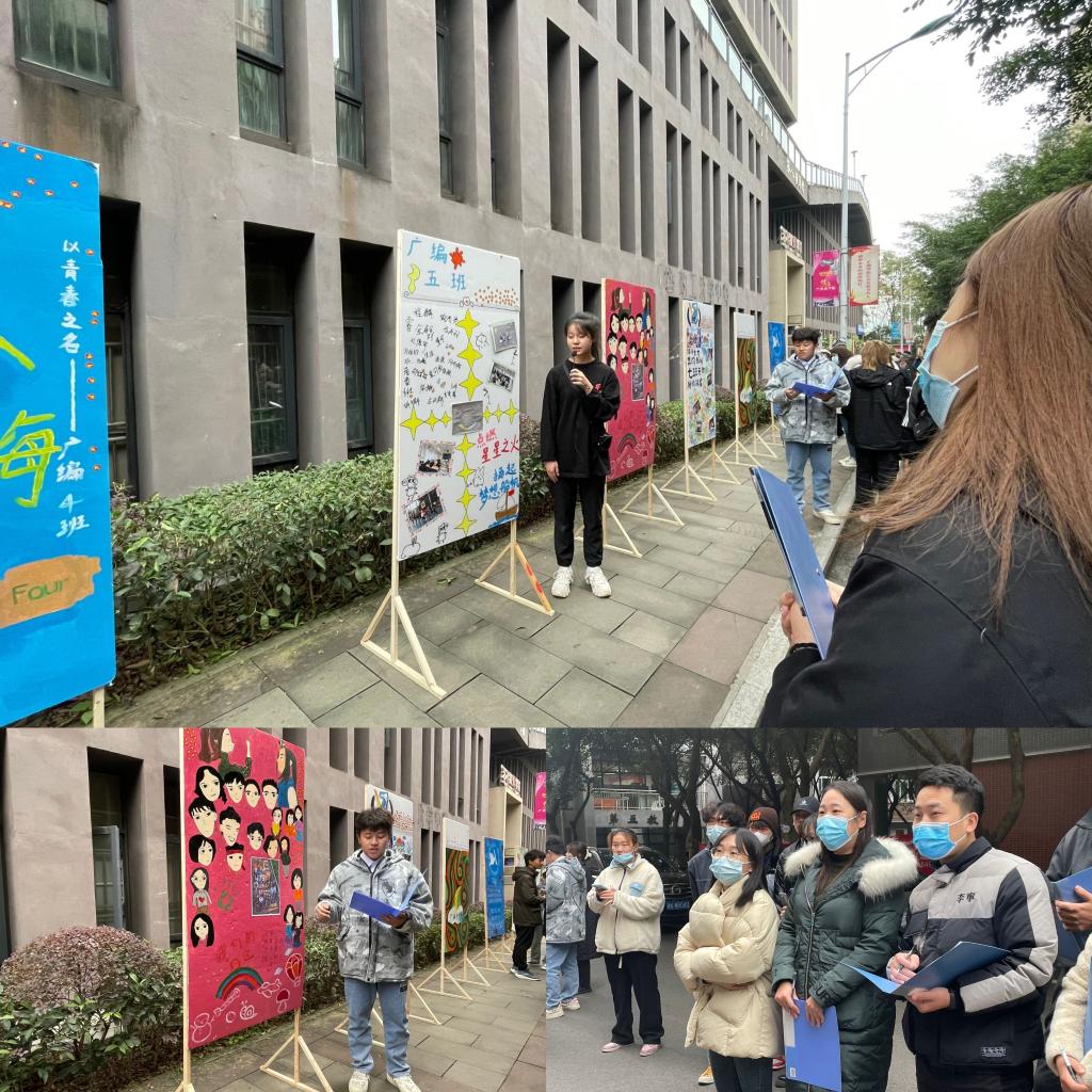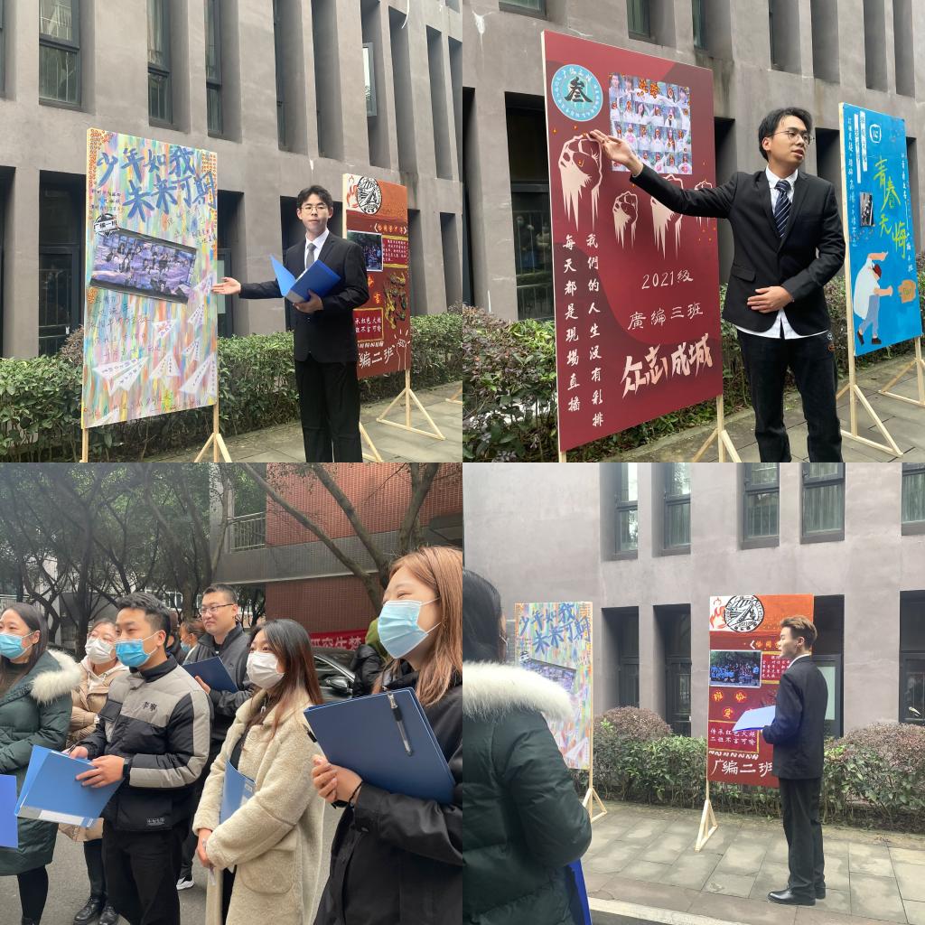本次答辩大赛由广编一班率先垂范,拥有不俗的表现。他们的答辩人身着西装,容光焕发,面对老师的提问毫不怯场,并且其展板色彩丰富多样,内容抓人眼球、有特色和新意,赢得了各位评委老师的称赞。广编的各个班级将丰富的想象力和创新能力运用到展板上,使评委老师们为之喝彩。