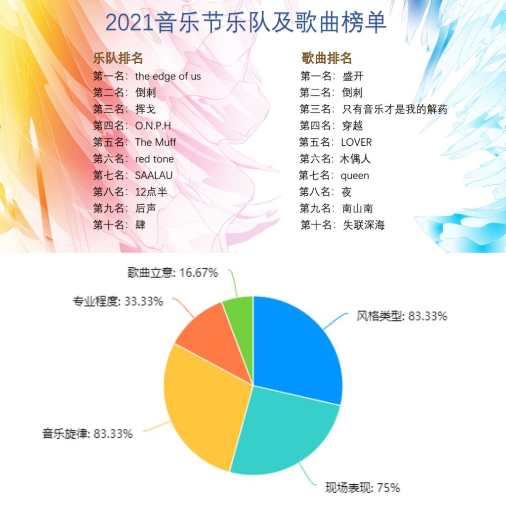 音乐节期间,通过发起关于本次音乐节最爱乐队和曲目排名在线调研问卷,共回收问卷218 份。结果表明,在最爱的乐队和排名中,排名前三的是 《the edge of us 》乐队、《倒刺》乐队及《挥戈》 乐队,其中在推荐理由中风格类型占比83.33%,音乐旋律占比83.33%,现场表现75%,而专业程度及歌曲立意分别只占33.33%、16.67%,未超过一半,这说明同学们对于音乐的喜爱程度大多是从个人偏好及现场反应评判得出。此外,经调研75%的同学对此次音乐节表示特别满意,16.67%的同学比较满意,并希望我们学校的音乐节越办越好。