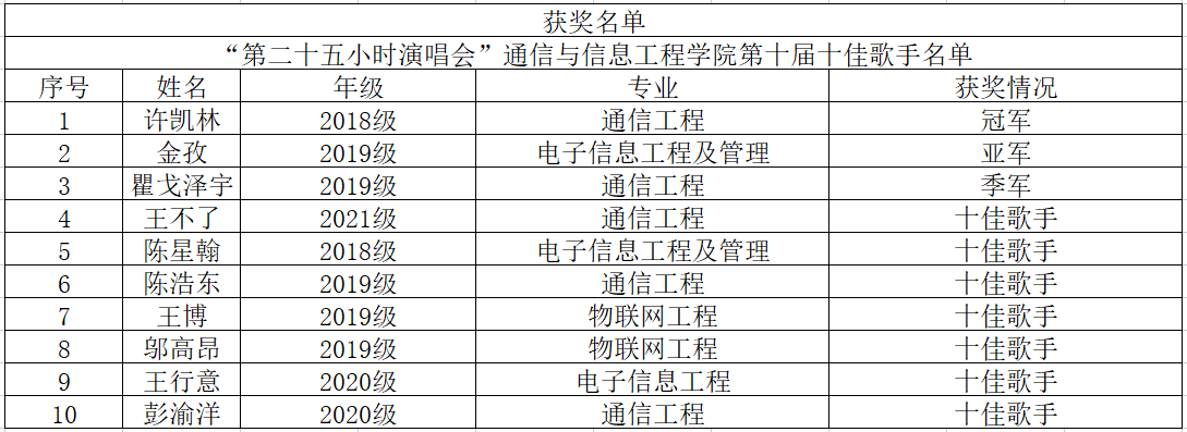 至此,通信与信息工程学院第十届十佳歌手决赛完满落幕。结束的是比赛,不变的是对艺术永恒的追求,在以后的岁月中,通信学子将以更加积极和乐观的态度向着更高水平的艺术与生活迈进。