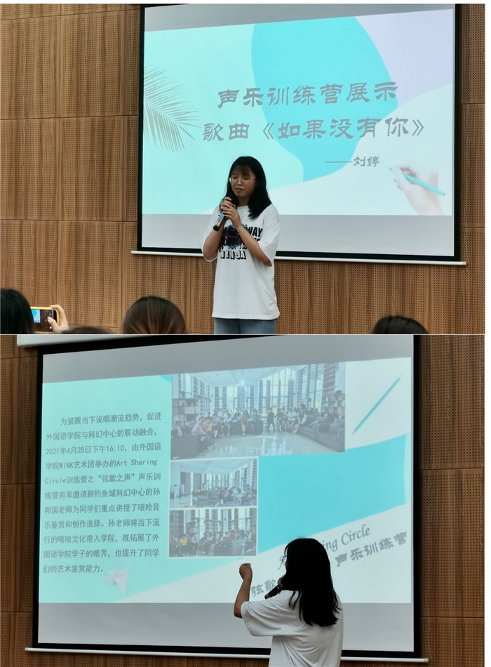 刚从安静的氛围中走出,欣赏由声乐训练营的成员刘婷演唱一首老歌《如果没有你》,这首歌凄切的氛围配上窗外淅淅沥沥的小雨,不禁让人产生悲伤的情绪。演唱结束,刘婷立刻情绪转变,回到开朗逗趣的性格开始为大家介绍本学期的Art Sharing Circle弦歌之“声”声乐训练营。她用幽默风趣的语言谈到在声乐训练营中孙邦国老师分享的嘻哈文化,其中她印象最深刻的是“Be real and be the real you”这句话,她表示在嘻哈中做自己,表达自我的态度,也希望与对嘻哈文化爱好者以后在训练营中共同探讨学习。