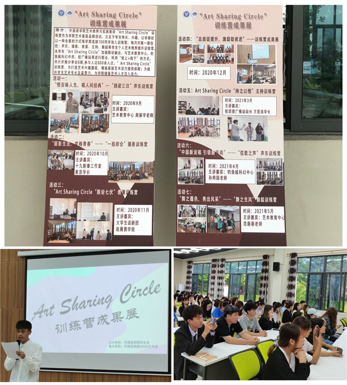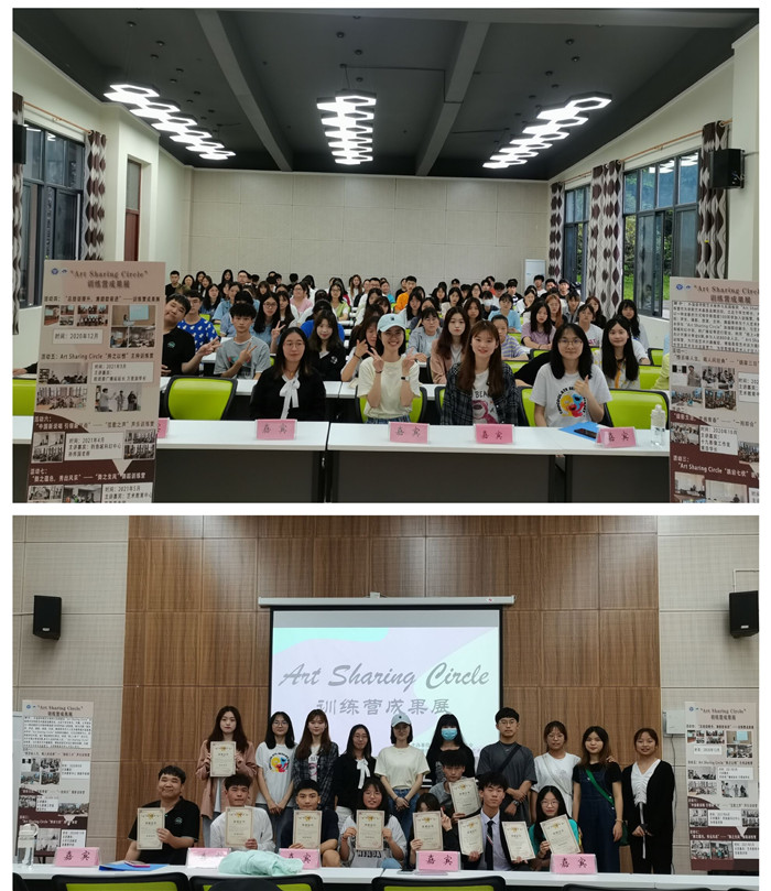 为营造外国语学院基层艺术学习氛围,展示Art Sharing Circle训练营成员这一学年的训练成果。2021年6月9日下午16:30,由外国语学院WINK艺术团举办的Art Sharing Circle训练营成果展在天渠报告厅111顺利开展。此次分享会出席的有校园社团活动板块指导老师兰鹰老师、艺术修养板块指导老师魏宇竹老师、外国语学院学生会主席杨晓莉学姐以及100余名训练营成员。