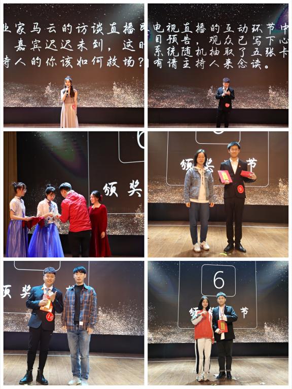 最精彩的部分要属最后的情景再现环节,在本环节设置了选手退赛、嘉宾迟到、礼仪摔倒、颁奖事故、观众互动共五个情景,来考验五位选手的随机应变能力,面对突发事故的临危不惧让现场的气氛达到高潮,其中廖祖勇表现尤为突出,为全场的观众许下实现所有愿望的期许,赢得了观众呐喊与欢呼。比赛到这里就全部结束,在主持人的带领下,进行猜人名的游戏环节,并邀请老师和同学们共同参与。师生互动,同台竞技,紧张激烈且不失趣味的游戏环节带动了台上台下的气氛。游戏结束,最终的获奖名单也新鲜出炉,老师们为获奖同学颁奖并送上祝福。