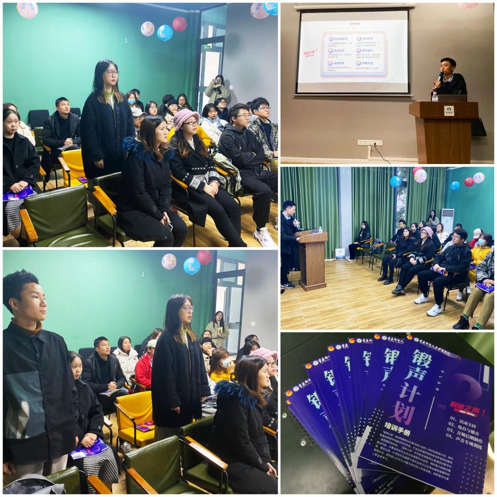 接下来的是由肖老师进行的培训环节,首先向同学们展示了一些学长学姐的作品,其中有他们培训前后的配音小节目、自制广播剧、公益片花等,充分体现了其声音的可塑性。从原本不太标准的发音,到字正腔圆咬字清晰,这些变化令人惊讶而期待。培训期间老师也让同学们对不同类型主持稿进行临场主持,老师一一细心地指出问题并做出示范,让同学们对主持有更深刻的体会。