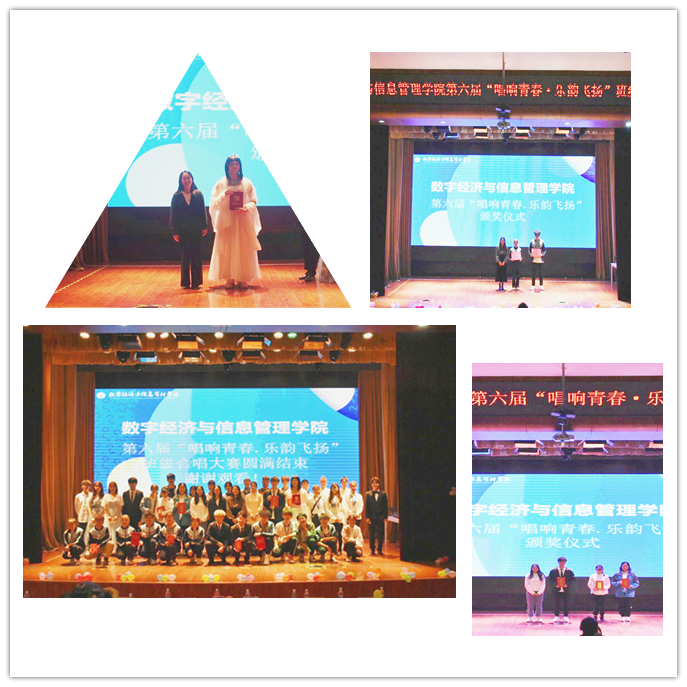 比赛接近尾声,在统计分数的间隙,彭薇薇老师现场即兴演唱了一首《后来》,将现场的气氛再次推向高潮,引发同学们掌声连连。经过一段时间的等待,本次合唱大赛的一、二、三等奖也终于揭晓。随后,叶芳老师、彭薇薇老师、王瑞等老师分别为获奖的班级进行颁奖并合影留念。