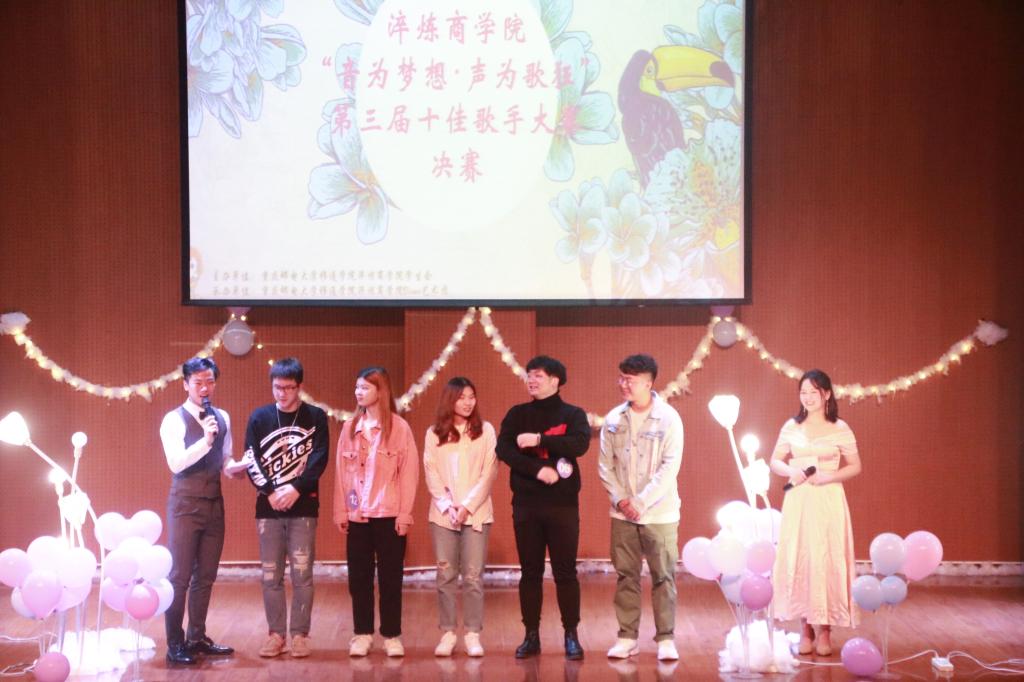 “九月口号声已停,歌声飞扬秋再来”。为了陶冶同学们的音乐情操,增加同学们的艺术修养和激发同学们对音乐的热爱,促进同学们完满发展。淬炼商学院第三届十佳歌手大赛决赛于2019年10月10日晚19点在下里巴人剧场如约而至。本次决赛邀请到的嘉宾有淬炼商学院副院长谢银平老师、淬炼商学院团总支书记刘薇唯老师、淬炼商学院学工办主任李光伟老师、通识教学部音乐剧老师刘慧琴老师、赵雨老师以及淬炼商学院各位辅导员老师。