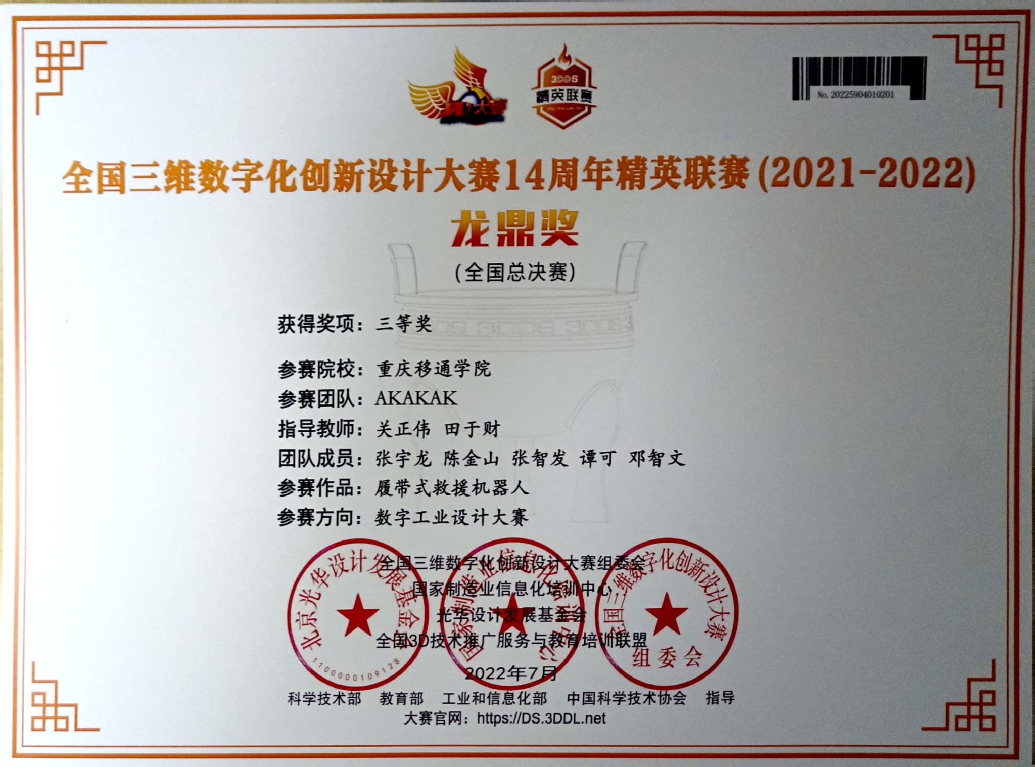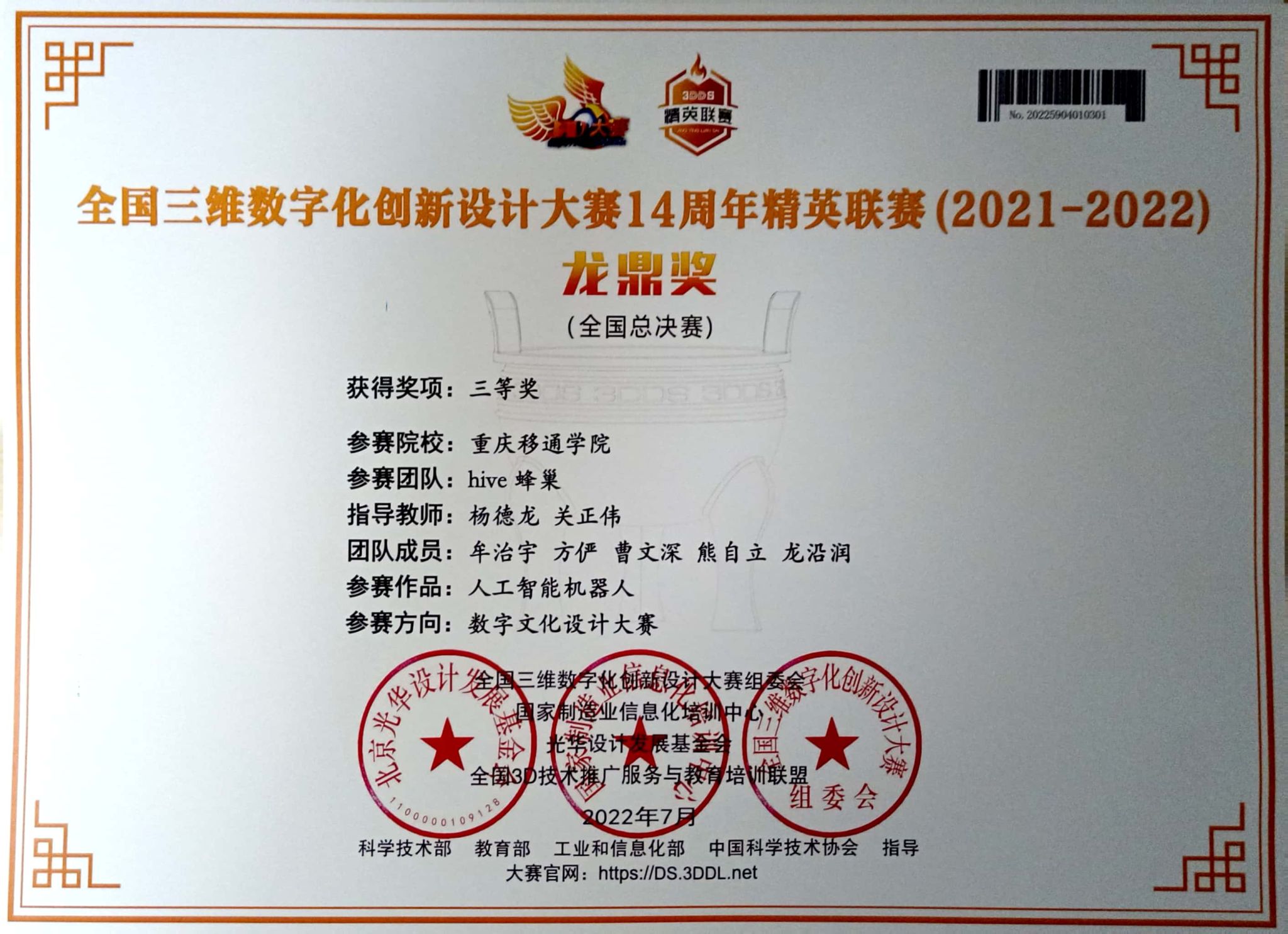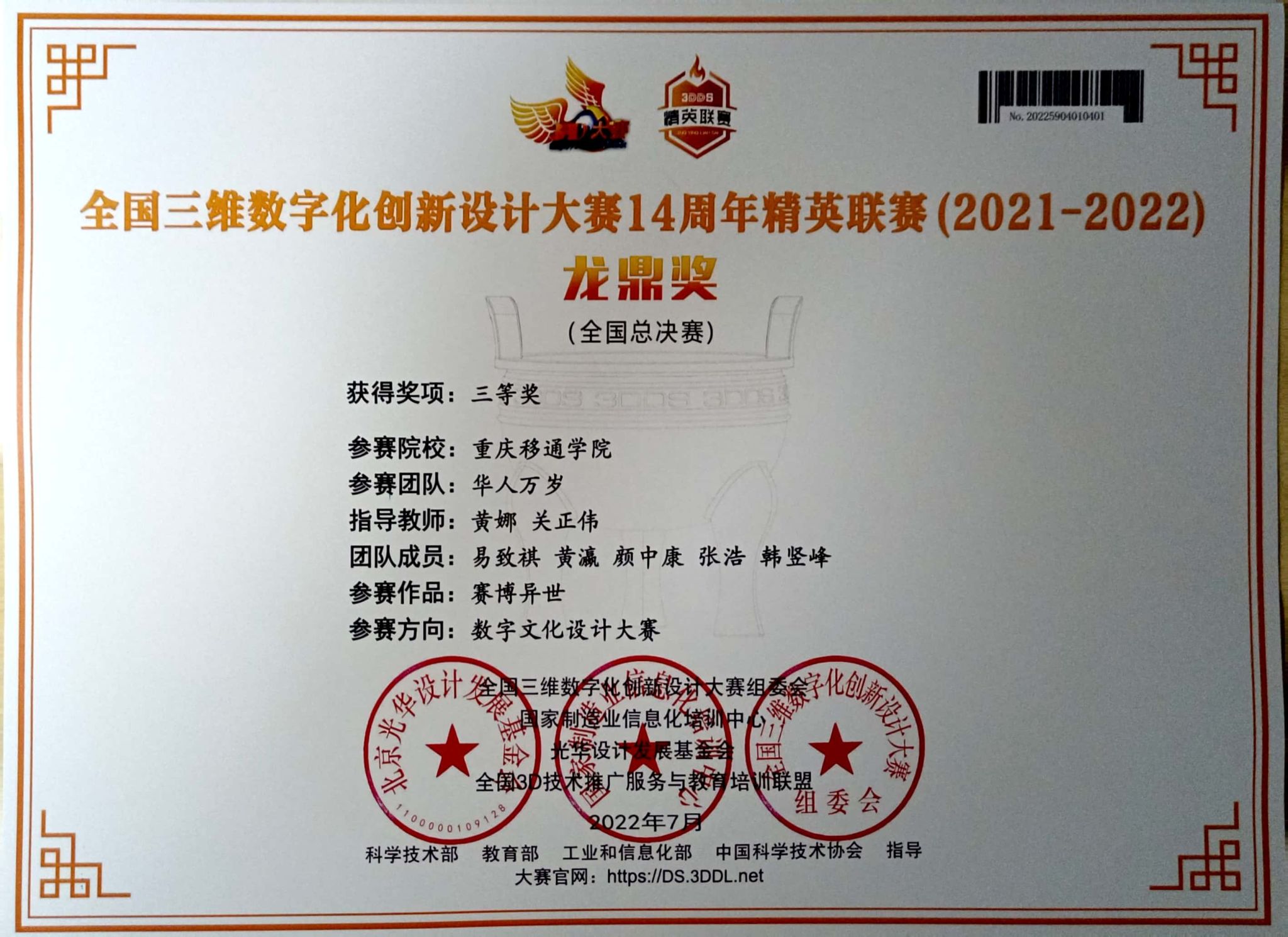 我校斩获全国三维数字化创新设计大赛14周年精英联赛(2021-2022)全国三等奖