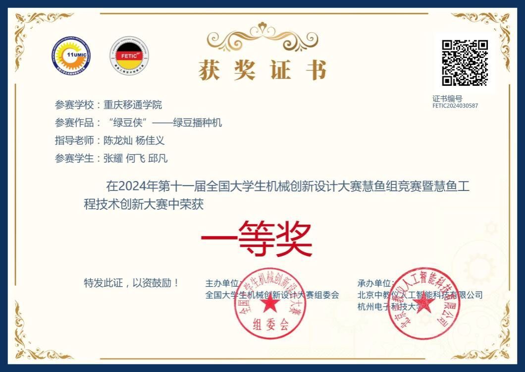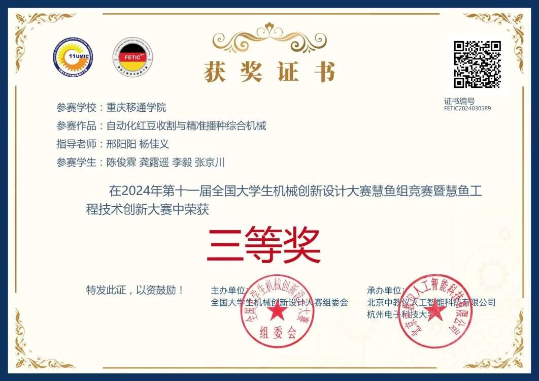 我校获2024年第十一届全国大学生机械创新设计大赛慧鱼组竞赛暨慧鱼工程技术创新大赛一等奖