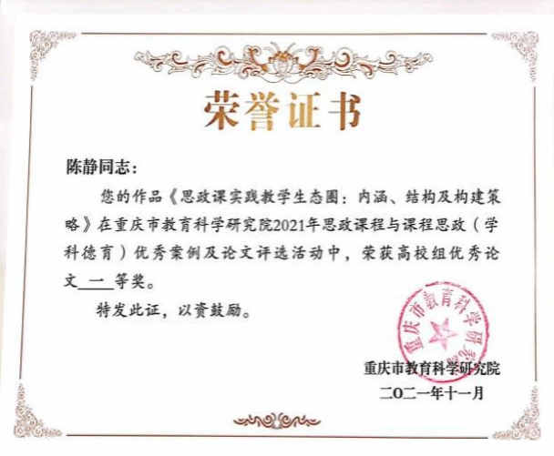 我校老师获重庆市教育科学研究院2021年思政课程与课程思政(学科德育)优秀案例及论文评选活动高校组优秀论文一等奖