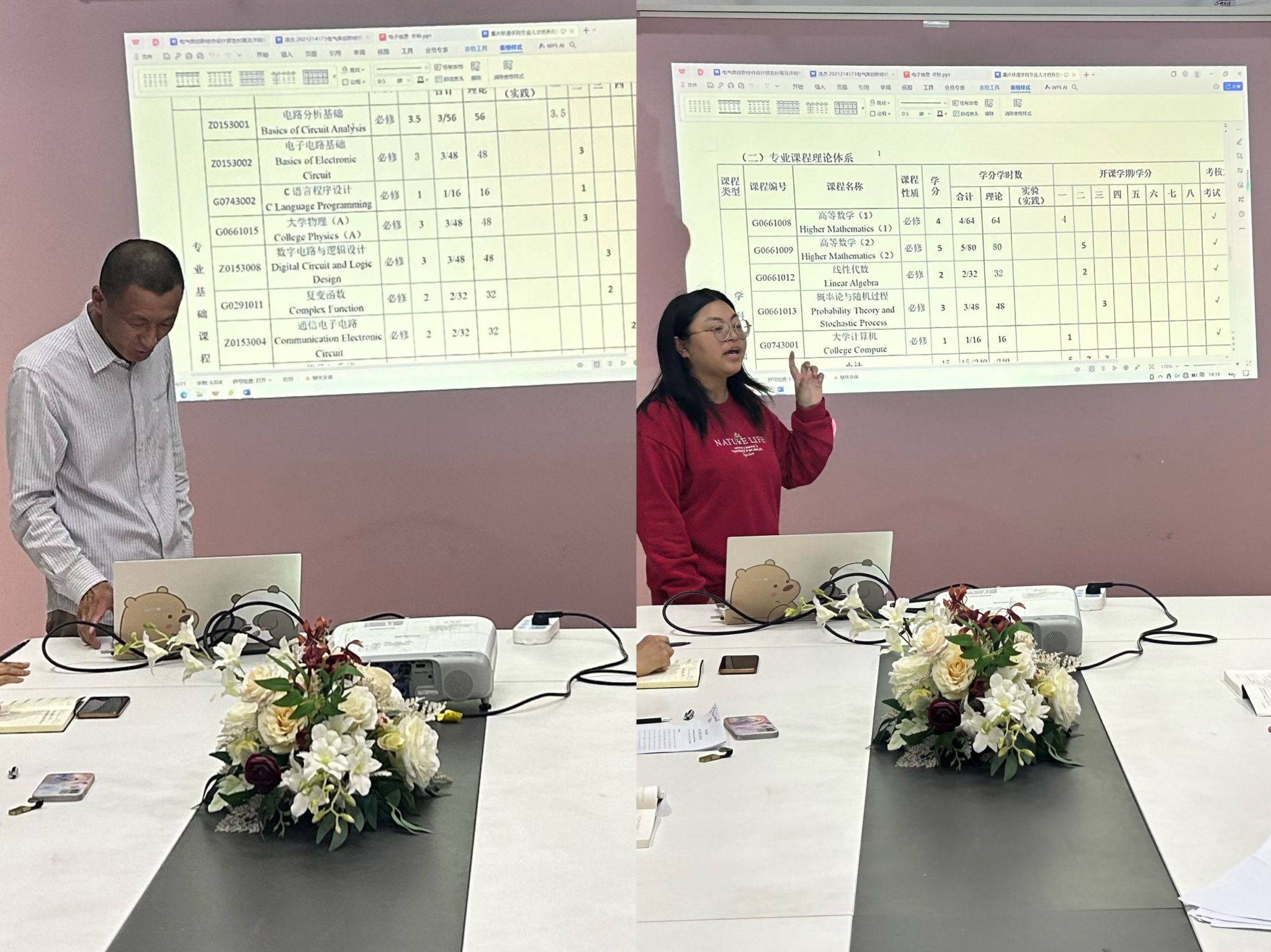 最后,几位专业负责人就学科基础课程和专业基础课程设置向数理教学部管悦、崔海生两位老师进行了咨询和请教。作为《高等数学》和《大学物理》的公共课教师,他们首先了解了我院通信工程、电信工程及管理、电子信息工程、电子信息科学与技术、人工智能五个专业培养方案中基础课程设置情况,然后为我们介绍了他们的课程内容及授课情况,让我们对专业课程中涉及到的数学知识有了更清晰地认识。同时,他们表示,各个专业在人才培养方案制定、课程教学大纲编写等方面需要进一步加强双方的沟通交流,就专业课程中涉及到的数学知识进行探讨,厘清前续课程和后续课程的逻辑关系,才能使讲授的知识不脱节。同时,他们也对开放性实践教学中如何融入数学知识,增强学生的考研竞争力,提出了建设性意见。