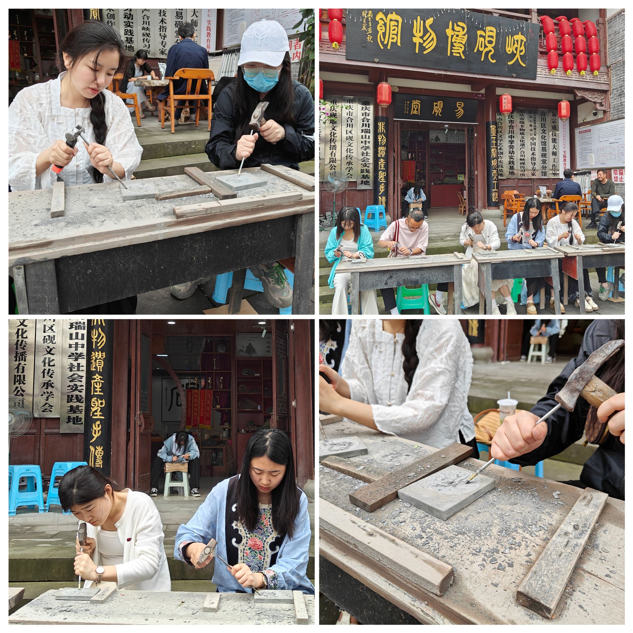 5月30日上午,集团三校四区全体参会教师一起前往移通学院校企合作挂牌的教学实践基地—合川峽砚博物馆,与合川峽砚传承人易宗成、黄平老师及其徒弟们进行深度探讨,并在传承人的指导下,开展了一堂峽砚技艺体验课,老师们转换为学员,拿着刻刀,一凿一刻,感悟非遗技艺的魅力。活动中,老师们还一同前往参观了移通学子2015级姜翰林、2021级万家鑫同学自主创业店铺,他们因移通非遗进校园与峽砚结缘,参与工坊传习,学习技艺,见证了移通非遗的育人探索。