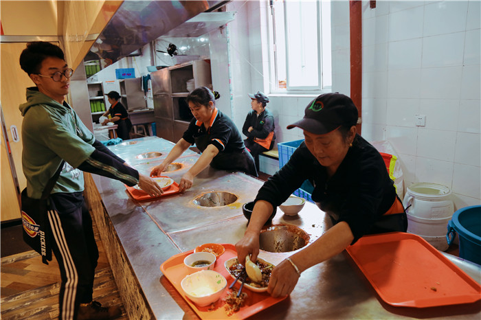 食堂大叔大妈早已准备好,在自己的岗位上掂着勺,等待着同学们下课。饥肠辘辘的我们,急急匆匆来到食堂,阿姨总能以最快的速度让每一位同学尽早吃上热腾腾的饭菜。她们日复一日的重复着自己的工作,但每次迎接我们的都是和蔼可亲的笑脸。