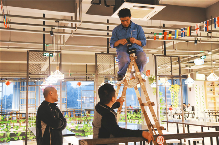 维修工人正急急忙忙的向维修点走去。他们的宗旨是:“为学生服务,不仅求速度更求质量的完成自己的工作。”他们辗转于学校各处,哪里的设施出现问题,哪里就有他们。他们不辞辛劳,即使是晚上,只要学生有需要,他们也会马不停蹄的赶往学生宿舍,第一时间为学生们解决问题。