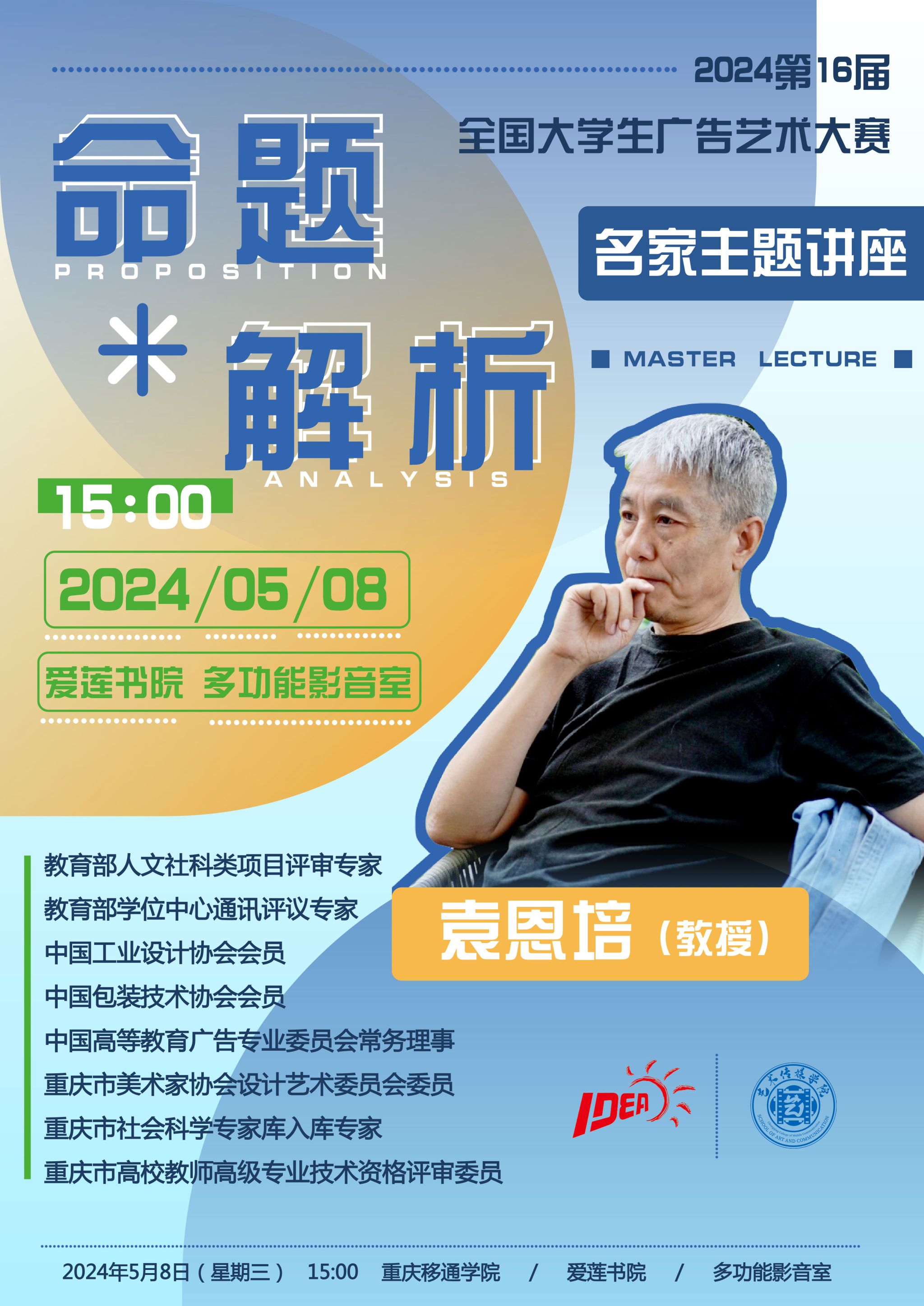5月8日下午15:00,第16届全国大学生广告艺术大赛—命题解析大讲座在重庆移通学院爱莲书院举办。本次讲座,特别邀请了重庆大学袁恩培教授进行专题分享,艺术传媒学院院长李轶天、副院长张梅、全体教师及部分学生代表参加本次大讲座。讲座由艺术传媒学院教师黄芸洁主持。
