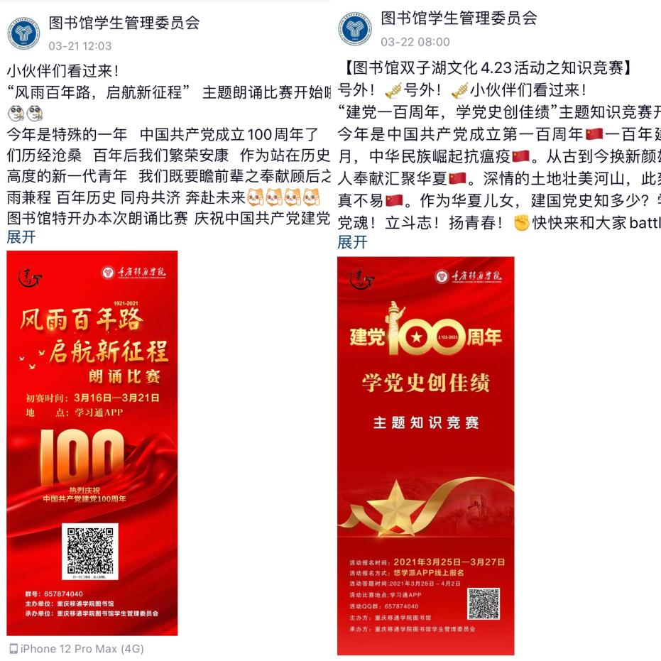 此次活动得到了图书馆领导和老师们的精心指导和帮助,专门成立了“双子湖”文化之4.23世界读书日竞赛类活动的专家评委老师。其中,通识教学部庞文化老师说道;“此次活动不仅让同学们积极参与到世界读书日活动中,更让同学们深入贯彻到党的历史与思想当中,去感受与体验这百年历史。”