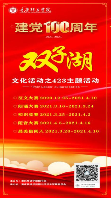 学校图书馆“双子湖”文化系列活动是学校师生读者与“四位一体”办学定位紧密结合的载体,是搭建与专业教育资源共享、与通识教育视野互通、与商科教育理念互惠、与完满教育效果互融的系列阅读推广网络。为迎接党的百年华诞,激发广大读者知党、爱党的热情,图书馆创新教育载体,突出服务职能,充分利用馆藏资源优势,特举办以庆祝建党100周年为主题的“双子湖”文化之4.23世界读书日系列活动,鼓励和引导广大师生走进图书馆与书为友、以史为鉴、启迪智慧,养成多读书的良好习惯。