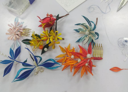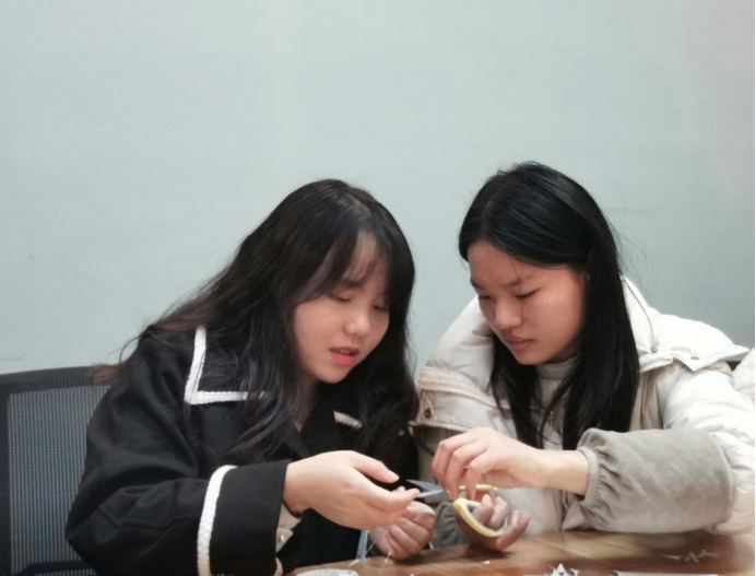 本次精品课堂由华韵汉服协会社长与簪娘社员共同教学。从回顾发饰材料的用法开始,详细讲解缠花的步骤和技巧,再由骨干社员协助初学社员进行制作。缠花做工细致,一条丝线可拆分为多条更细的线,除了基本动作“缠”占九成九,还要把线搓开加上其他绕、捻、盘、绑等的技法。在学习缠花的过程中,社员由于技法不熟悉,常常会出现“露白”,造成成品不美观的情况,而后通过社长的教学与讲解,慢慢修饰,也了解到什么样的弧度容易挂线,什么方向的缠线角度不易滑线等,大家也在一次次缠绕中找到技巧,逐渐克服丝线包不住纸板的困难,同时也让社员感受到制作缠花的不易和乐趣。