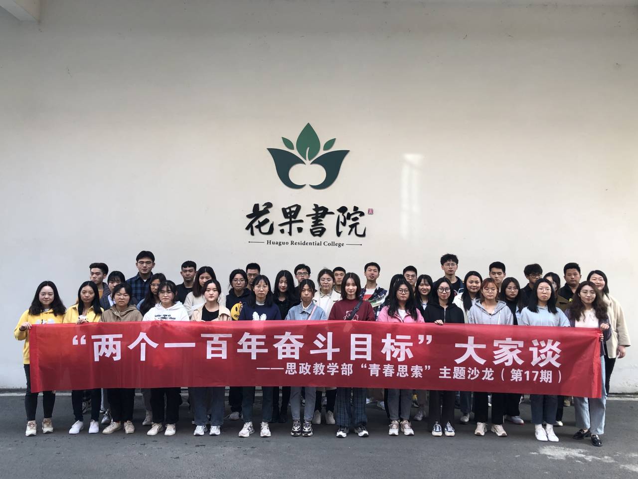 2021年2月习近平总书记在春节团拜会上的讲话中指出:“全面建成小康社会,实现第一个百年奋斗目标,在中国共产党奋斗史、新中国发展史、中华民族文明史上都具有里程碑意义。同时,我们必须认识到,这只是我们迈向中华民族伟大复兴的关键一步,我们决不能骄傲自满、止步不前,要继续谦虚谨慎、戒骄戒躁,继续艰苦奋斗、锐意进取,为实现第二个百年奋斗目标、实现中华民族伟大复兴而奋力拼搏”。为了总结第一个百年奋斗目标的经验,展望第二个百年奋斗目标的未来,激励广大青年学子为实现中华民族伟大复兴的中国梦不断进取,思政教学部德育教研室于3月24日下午4点在花果书院组织了题为“‘两个一百年’奋斗目标大家谈”“青春思索”主题沙龙(第十七期)。李亚莉、梅月红、李潇潇三位老师以及2018级、2020级学生代表共计30余人参加了本次活动。