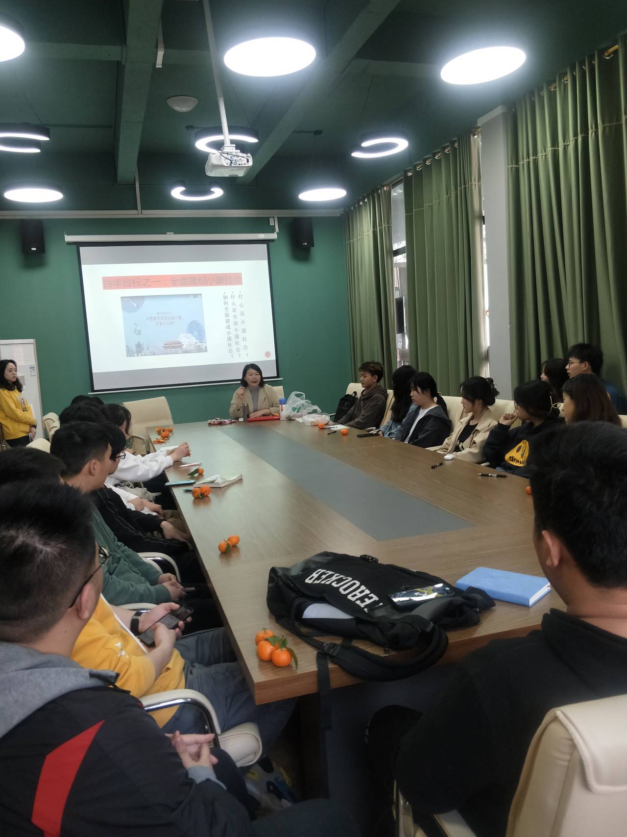 活动第一项是总结讨论第一个百年奋斗目标,大家首先谈到自己对于“全面小康”的看法。李亚莉老师说,我们要实现的小康不是指某一项发展所要达到的某种水平,它包括很多方面,比如经济发展水平、政治文明程度、精神文化发展、社会和谐程度、生态文明程度等,总体目标是让人民过上更加美好的生活。接下来,师生间通过交流分享自己身边的生活变化,表达了自己对的“全面建成小康社会”的感受。刘琳同学说,“小康”体现在生活中的方方面面,自己最大感受在于交通工具越来越方便快捷,特别是中国高铁,跑出了中国速度;张成瑞同学说,自己最大感受是住房的变化,以前全家五口人挤在不足60平方米的小房子里,如今家里的房子变成了150平米的大房子,每个人都有自己的卧室,还有国家推出的公租房,解决了无力购买商品房的低收入者的住房问题,实现了居者有其屋。师生们畅所欲言,清晰地描绘了自己感受到的小康生活,同时也认识到实现第一个百年奋斗目标的来之不易,也感受到了时代赋予给当代青年人特别是大学生的实现第二个百年奋斗目标的历史使命。