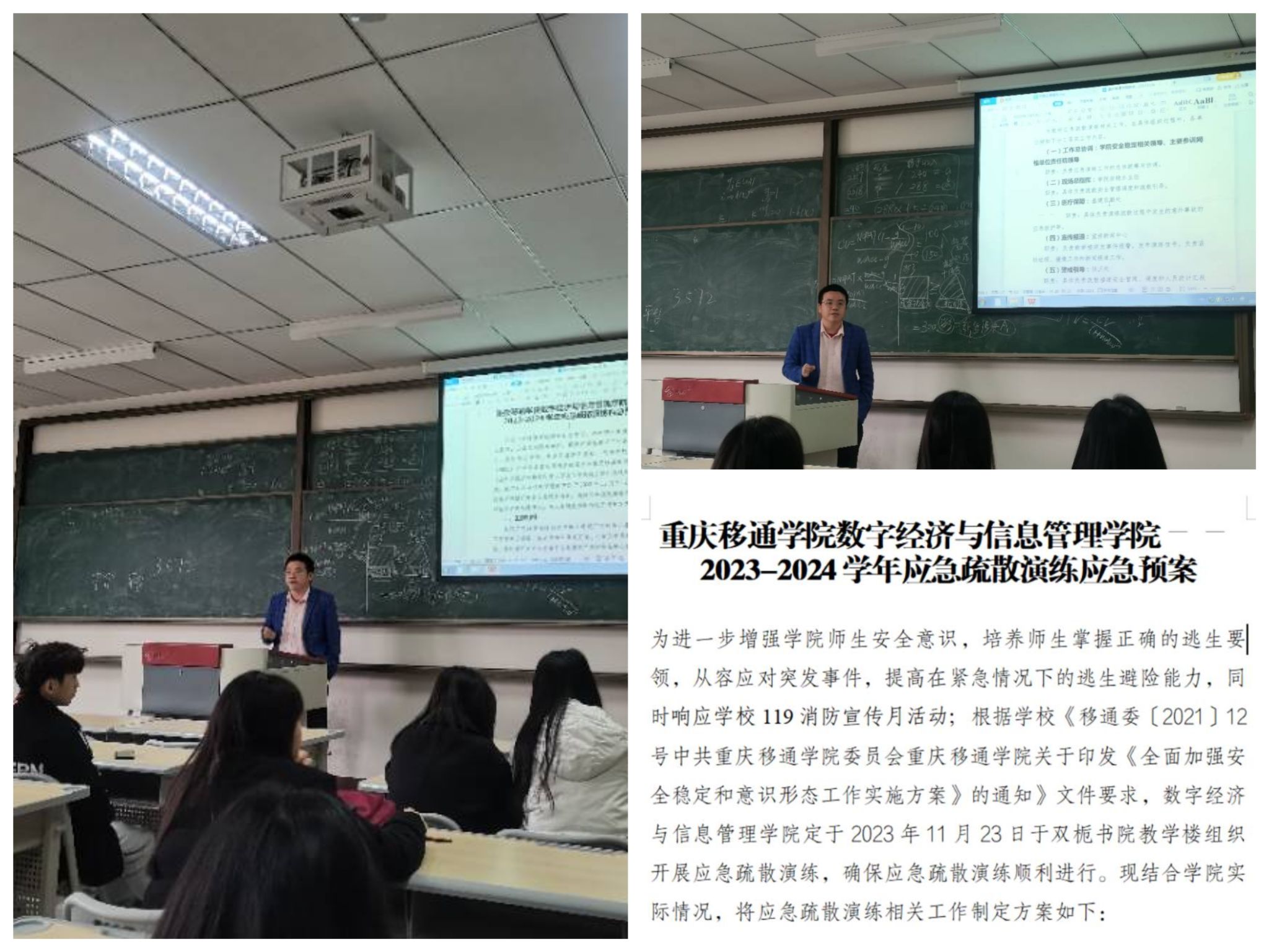 为进一步增强我院师生安全意识,培养师生掌握正确的逃生要领,从容应对突发事件,提高在紧急情况下的逃生避险能力,同时响应学校119消防宣传月活动;根据学校《移通委〔2021〕12号中共重庆移通学院委员会重庆移通学院关于印发《全面加强安全稳定和意识形态工作实施方案》的通知》文件要求,数字经济与信息管理学院于11月23日上午10:40在双栀书院教学楼成功组织了一场应急疏散演练,着力提升全院师生防灾减灾意识、应急疏散能力。