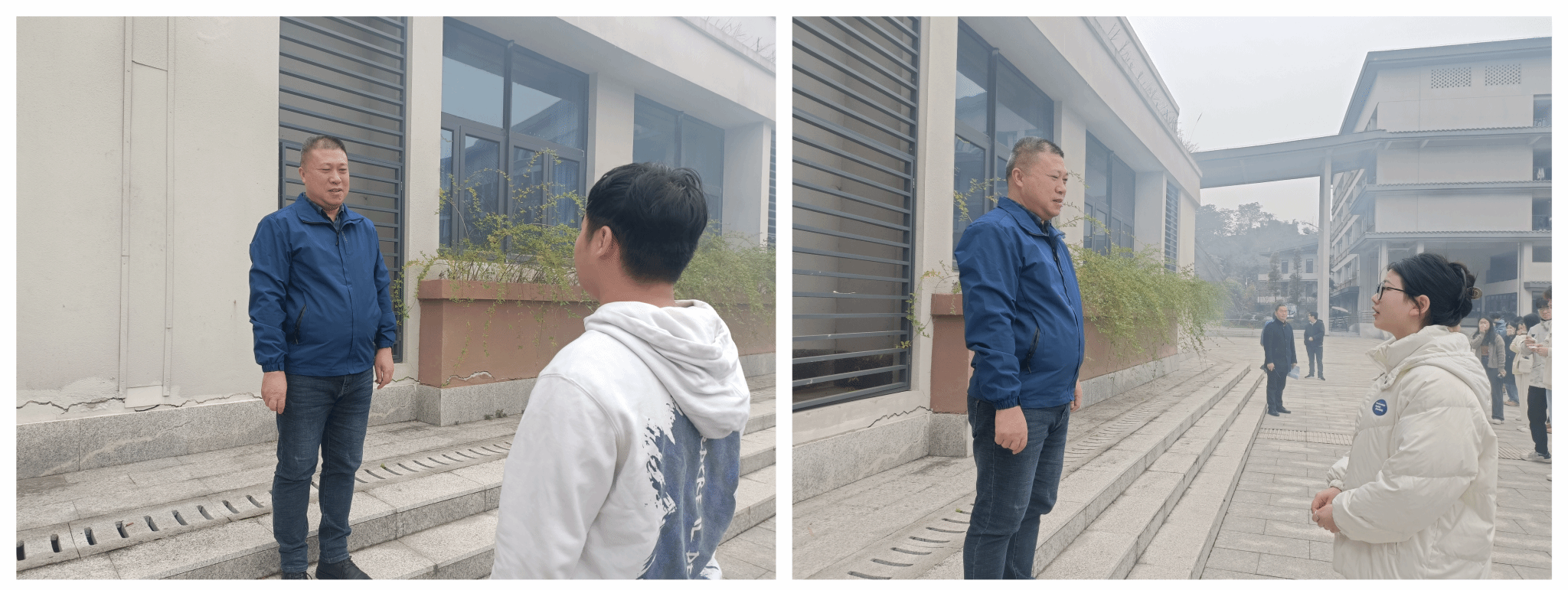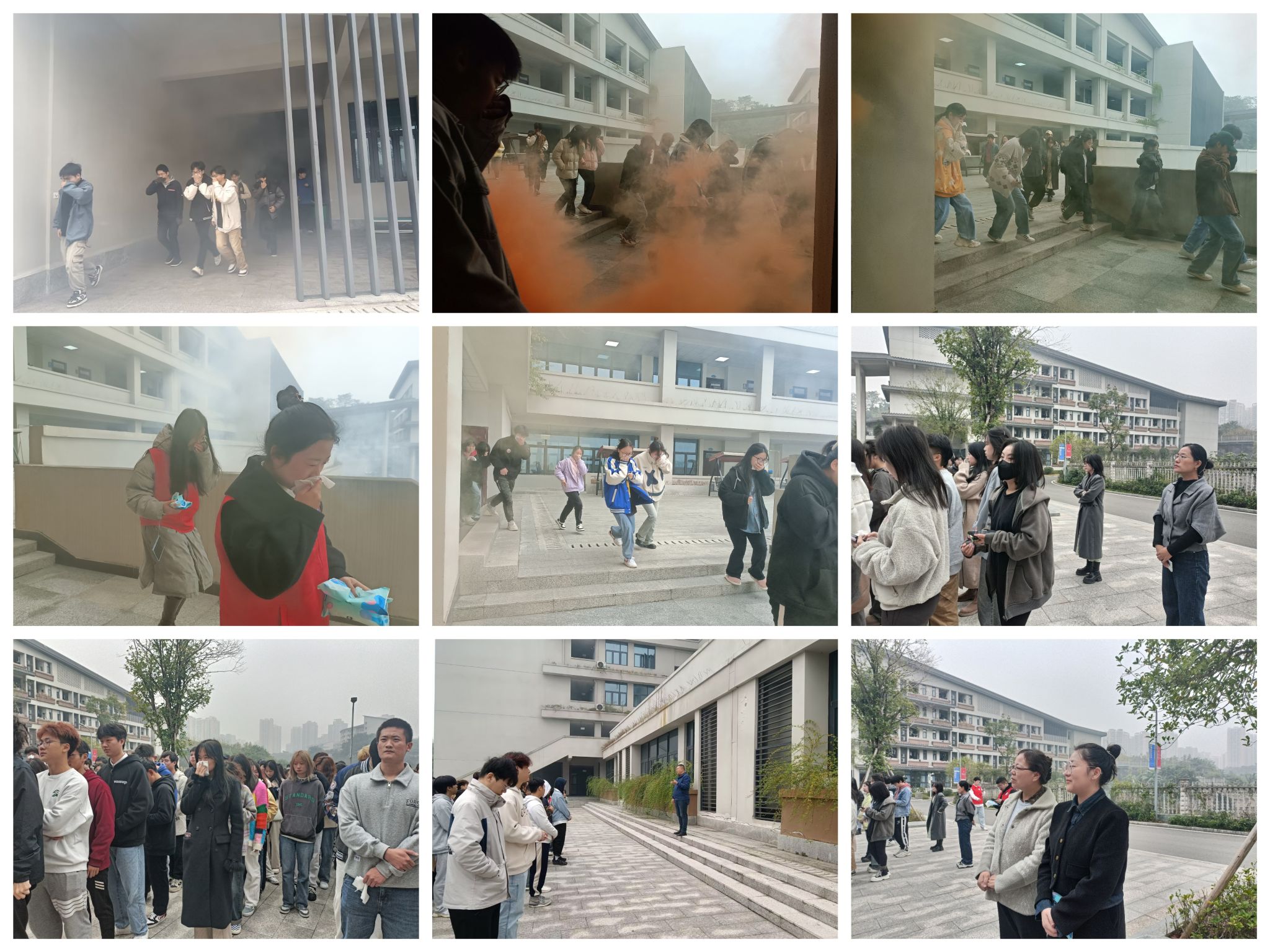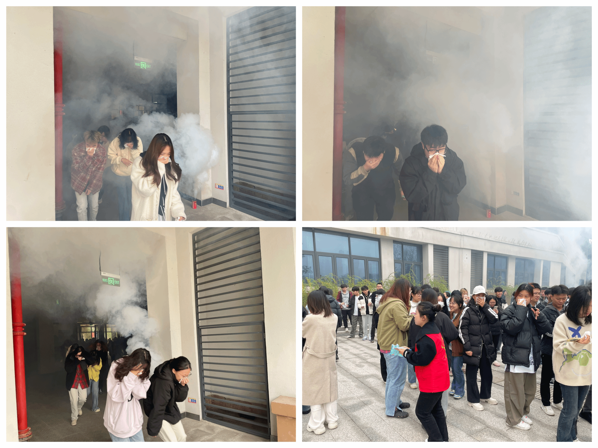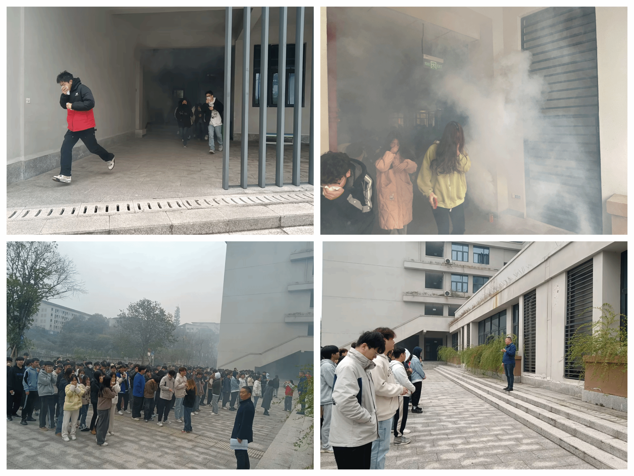 2023年11月23日上午10:40,各楼道疏散负责人员已经提前到达指定位置。随着潘院长口哨吹响,志愿者立即拉起演练烟雾罐,模拟出实际火灾的场景,各班任课老师立即向学生发出指令:“大家分别从前后门有序疏散,面向疏散方向每个门成一路纵队撤离”。在老师和班委的引导下,同学们弯腰,领取湿巾并用其捂住口鼻按照既定疏散路线,迅速疏散至双栀书院小广场,各班班长清点人数并向潘院长进行汇报。