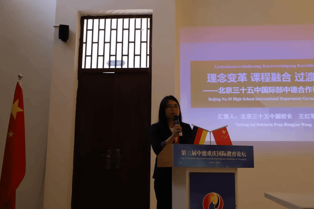 北京市第三十五中学副校长王红军进行专题报告二理念变革课程融合过渡衔接的讲解。她表示“要教育助力学生认识自我、探索、发现、选择未来学习领域。”学校的人才培养目标是培养出具有学科核心素养的国际化应用型人才,王红军校长介绍了北京第三十五中学小学、初中、高中、国际部一校四址的特点办学。从而通过建立德国友好校,进行双外语教学,大学衔接课程等办学模式,从根本上改变人才培养模式,培养出具有自我认知,根植祖国具有民族自信的新型人才。最后王校长表示希望中德能够拥有更多的合作机会,共同推进中德教育。