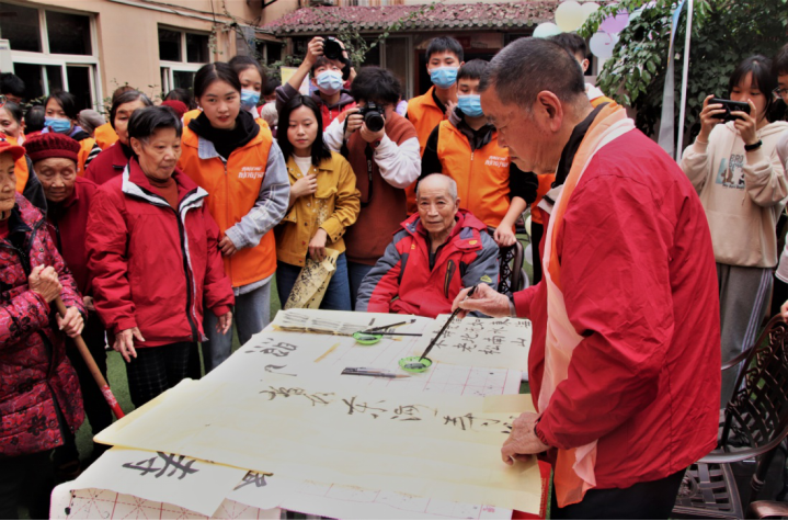 除此之外,今天还特别为老人们带来“舞台+外围”的体验新模式。美食协会以佳肴为念,与老人共同制作传统美食;书法与美术协会以书法沟通,与老人共同体验传统文化的魅力;DIY手工协会以红绳为轴牵动老人的心……其中一位老爷爷拿起毛笔,挥斥方遒,演绎属于他的青川岁月。养老院里还有这样一位爷爷,他是历史的见证者,为我们讲述了他参与抗美援朝的故事,进一步深刻了我们对历史、对文化的认识。
