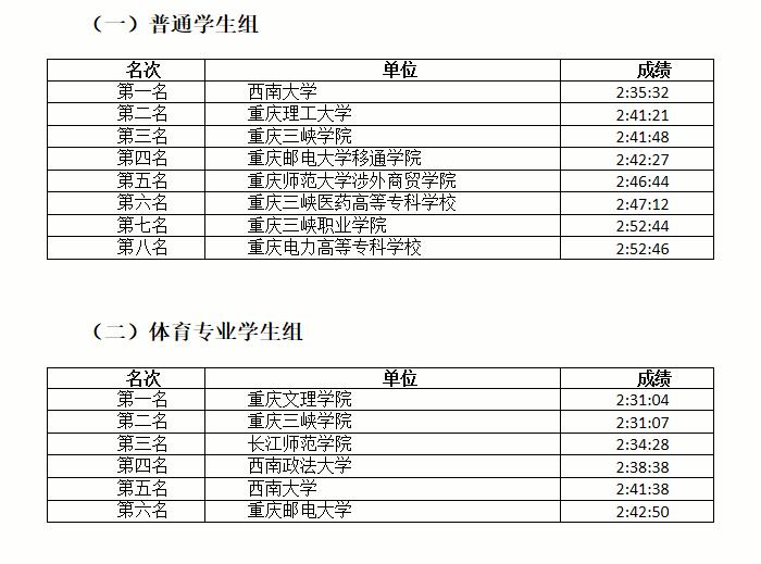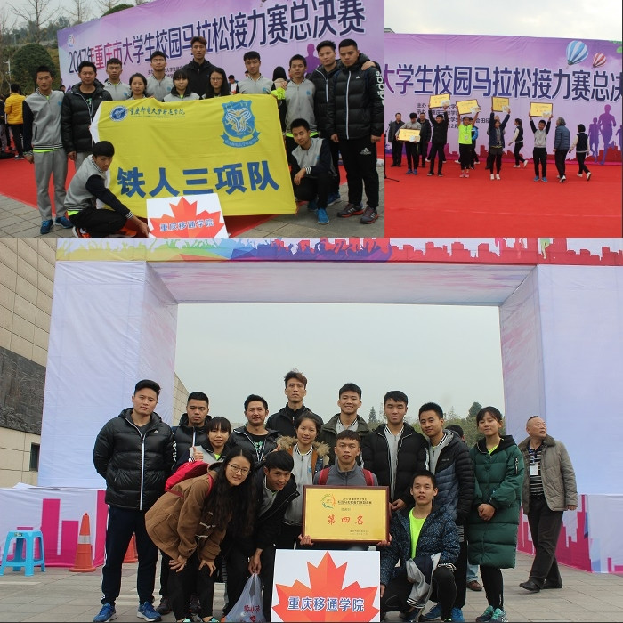 12月10日,2017年重庆市大学生校园马拉松接力赛总决赛在重庆三峡学院打响,本次比赛吸引了重庆市19所高校组队参加,经过两个多小时的激烈角逐,最终我校铁人三项队获得普通学生组第四名的优异成绩。叶娇、李才鹏两名队员获得体育道德风尚先进个人,黄静获评本次比赛的优秀教练员。