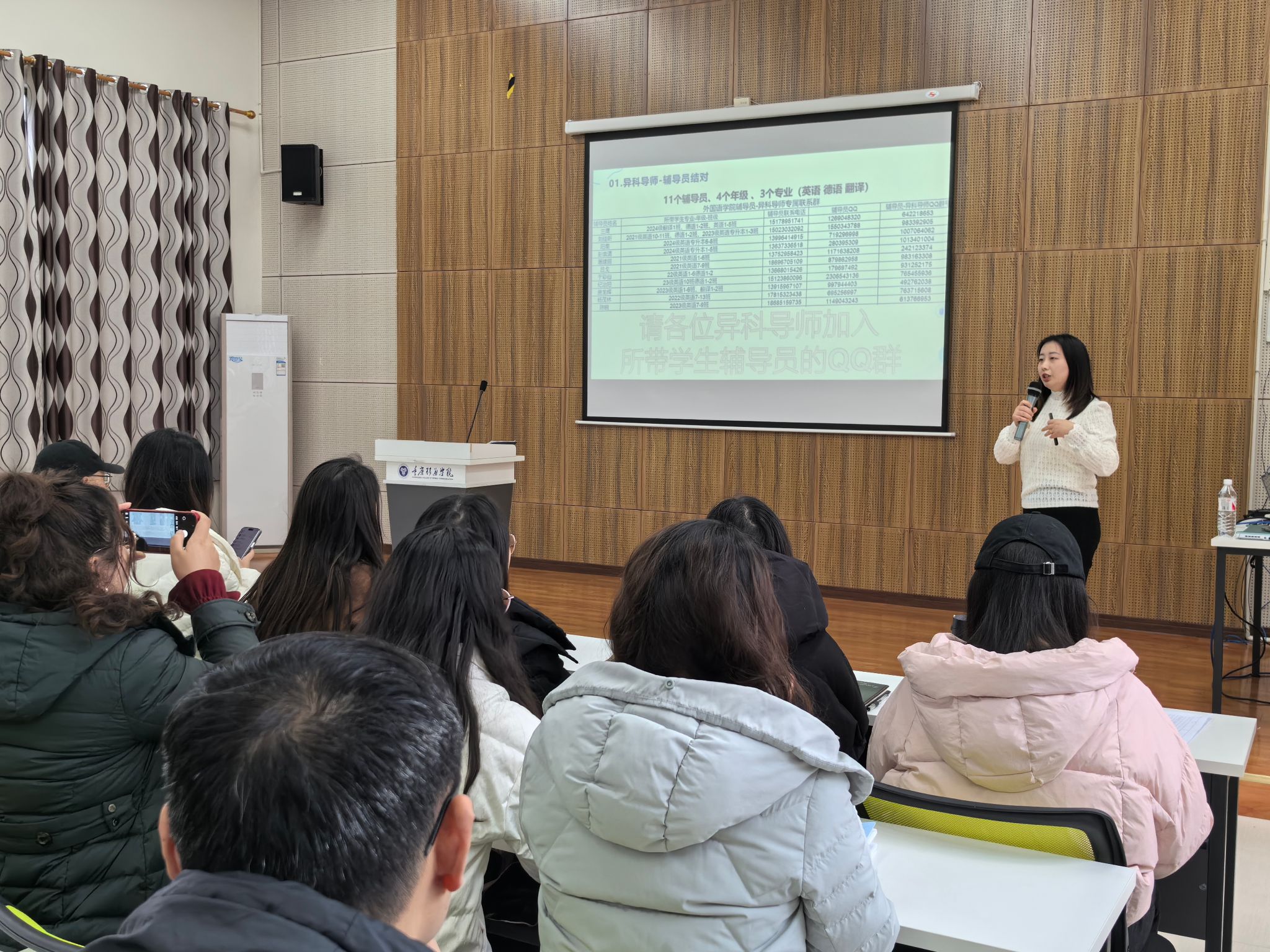 为进一步落实全员育人理念,深化异科导师制工作实效,外国语学院于3月5日下午两点在天渠111报告厅组织召开2024-2025学年第二学期异科导师见面会。会议由学院双院融合专项负责老师兰鹰主持,外国语学院副院长马喆老师、全体辅导员及异科导师参会,围绕新学期工作计划、学生成长支持体系等主题展开深入交流。