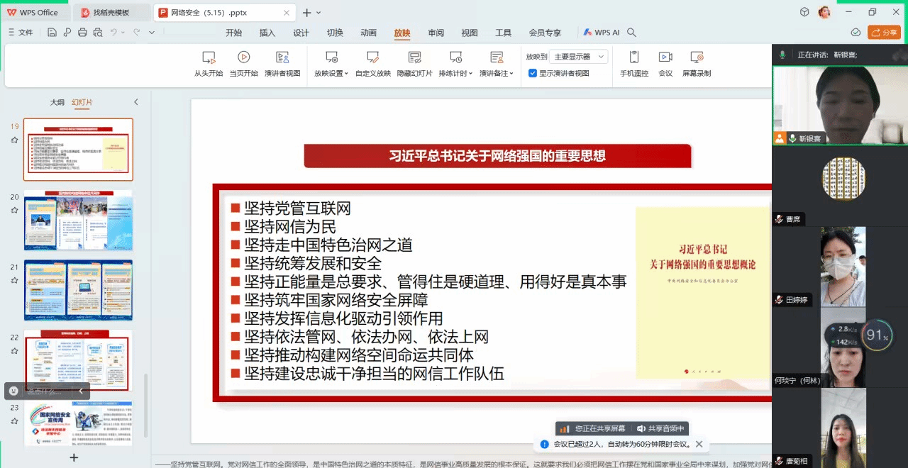 为进一步强化团队教师网络安全意识、树牢意识形态安全防线,不断用习近平新时代中国特色社会主义思想武装头脑、凝心聚魂、指导实践,5月15日下午三时,《中国近现代史纲要》教学团队组织全体成员线上深入学习了“习近平总书记关于网络强国的重要思想”,会议由团队负责人靳银霞老师主持。