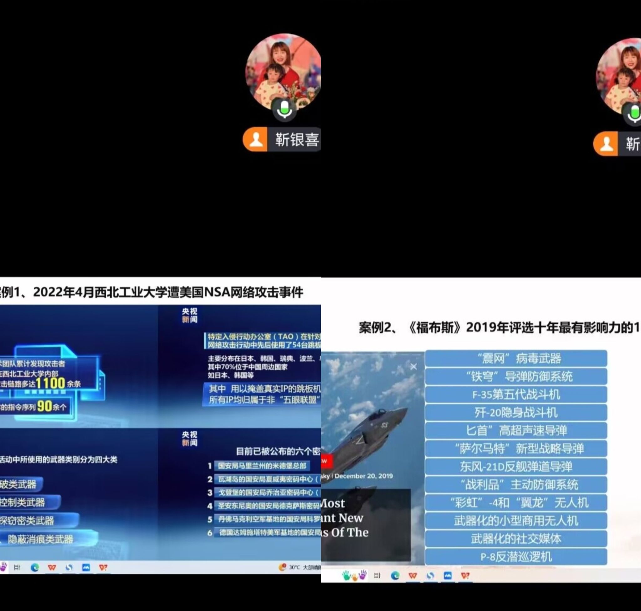接着,靳老师结合当前网络意识形态安全面临的形势,联系西北工业大学遭美国NSA网络攻击、“震网”病毒武器、俄乌冲突前后网络战全面开打、万豪国际遭网络攻击、手机网络诈骗等实例,从网络整体形势、法律法规、常见数据泄露的途径、维护和增强网络安全的途径与方法四个方面,分析了网络安全的重要性以及建设网络强国的必要性。