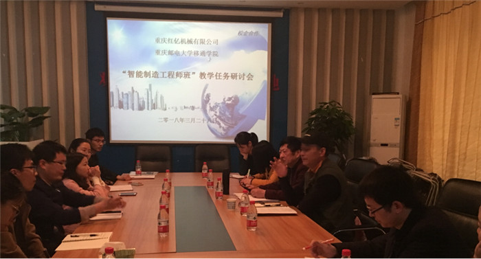 红亿公司与移通学院为了共同推进“智能制造工程师班”的人才培养,于3月28日下午,在双体系会议室举行了“智能制造工程师班”教学任务研讨会。出席此次会议的人员有重庆红亿机械有限公司姜国宾总工程师、重庆邮电大学移通学院副院长尹邦满博士、自动化系主任汪纪锋教授以及相关课程老师。会议由汪纪锋教授主持,研讨会在隆重热烈的气氛中进行。