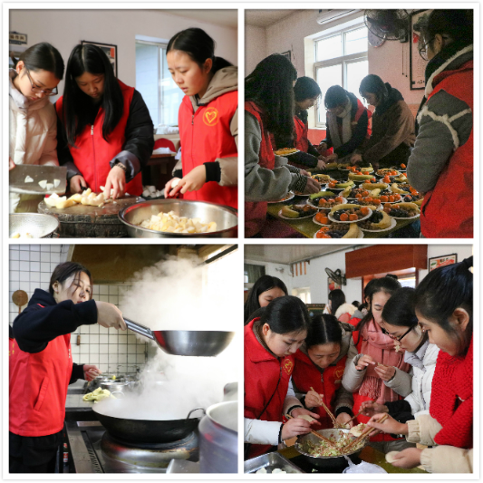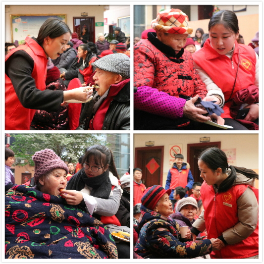 (志愿者为老人们准备水果拼盘、枸杞雪梨汤、包饺子)