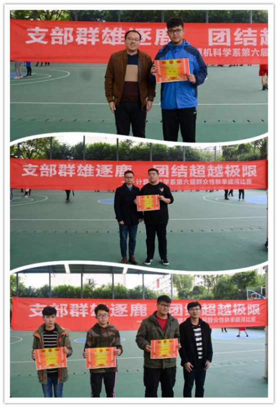 一根绳子,不需很长;一块场地,不需很大;一场比赛,正悄悄的出现在图书馆门口,c区风雨篮球场和足球场的某个角落。没错,这就是计算机科学系第六届群众性秋季拔河比赛。赛场上不仅有2017级计科辅导员马喆老师冒雨为同学们加油,还有辅导员王焱老师为获胜班级颁发奖状。