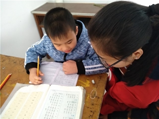 坐好,放下书包,拿出作业,孩子们埋头于书本中,专注地做着作业。小e放轻脚步,静静地看着孩子们,时不时地给孩子们指出作业中的错误。“姐姐,这道题这么做。”“哥哥,到这来,给我讲讲这道题。”小e们耐心地解答着,以自己认为最容易理解的方式说给她们听,一道又一道,一遍又一遍,希望把每一道题都讲得完美,让孩子们听得懂。时间在笔尖的沙沙声中流逝,孩子们都完成了作业,露出了甜甜的笑。看到孩子们脸上那纯真的笑容,小e们也感到高兴,阳光洒向教室,让人暖暖的,而孩子们的笑就如那暖阳,温暖着小e们的心田。