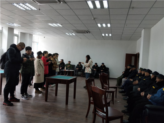 “戎装虽舍心难舍,梦里几度女儿情。濒近复返心忐忑,来生再续军营缘。”当兵的人,对家人或是朋友,都有着更深的眷恋和深情,而我们的志愿者同学们有幸,能在寒风飒飒的初冬,来到光荣院。 在经历了漫长的车程过后,志愿者们到了一栋白色建筑楼的门前,我们不禁收敛了笑声,降低了说话音量,仿佛怕打扰到这栋楼的庄重和严肃。在有秩序的进门后,院负责人让我们先进活动室等待,而那时已经有几个老爷爷在沙发上静静地坐着,看起来不苟言笑。因为光荣院的特殊,我们开始有一点拘谨,但突然有一个老爷爷开口打破了沉默的气氛,他坐在沙发上,裹着一身军绿色的大衣,头上松松的戴着一顶军绿色棉帽,“来唱歌,来!”我们紧张的心情,也被这个老爷爷的热情所感染,逐渐放开自己。越来越多的老爷爷到来,进门后每个人都整齐的坐在沙发上,给让我们感受到了军人的素质和修养,活动室也热闹起来,我们的志愿者就主动集合为大家唱歌来活跃气氛,一首首红歌,唱响在小小的活动室里,老爷爷们为我们鼓起了掌声,脸上也挂满了笑容。