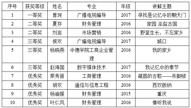 6号选手杨渝媛在讲解中对于重庆棒棒的精神做了很好的升华;7号选手叶仁凤一口播音播音腔让老师眼前一亮,在主题讲解重点突出,逻辑清楚;8号选手刘岩区别于其他选手在主题讲解之时心态积极向上,乐观、热情地表达了自己的故乡情;9号选手曾珂讲解朝天门的码头文化,简述了古到今的历史发展,语言流畅,时间控制好;而此次比赛唯一的一位男士10号选手赵海国从地貌开始了对奉节的讲解,他带来的脱口秀才艺亦是十分的精彩。