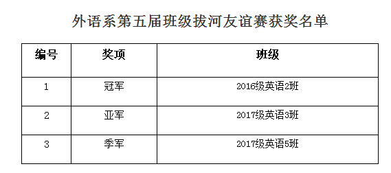 这所有参赛队伍中最亮眼的当属16级英语2班,在第一轮开始时就表现出了力争第一的决心,努力拿下初赛。跌倒了只会让他们以更坚定的决心站起来,受伤也只会让他们把绳子握得更紧。在后面的比赛中一路过关斩将,顺利进入了决赛。他们也用实际行动回应了这些欢呼与呐喊声顺利拿下了第一。