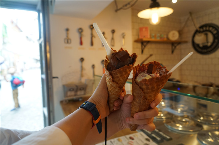 到了德国最让我兴奋的是德国各式各样的冰淇淋,放眼望去,冷饮店的玻璃柜台里不同口味的冰激凌一字排开,五颜六色让人看花了眼,品种多的只有你想不到。最常见的莫过于香草、巧克力、咖啡、各种水果口味等,同时还有许多不同的搭配,例如配葡萄干、坚果。德国的冰激凌或者说是欧洲的冰激凌它有些品种是掺杂酒的,类似于朗姆酒,它不像国内只是挂个名牌说说而已,它是真的含有酒精。但是有酒精的冰淇淋要年满18岁,当时去买的时候,还要求我们出示护照了。不过,在琳琅满目的冰淇淋中我最喜欢巧克力。它有着最浓厚巧克力味的奶球,当冰凉的奶球在嘴里慢慢融化的时候,你会觉得整个世界都明亮起来了,好像压力也随之不见了。配上烤的酥脆的华夫卷,鸡蛋和奶油的散发出来对的醇香配上香浓的巧克力。减肥在那时候都是无关紧要的。