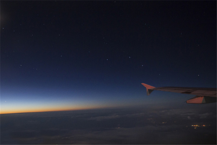 距离像海水一样满溢,她漫过机舱的地板、我的脚踝、安全带、小桌板...慢慢的它一直蔓延到我的胸口,直到头顶。长距离的飞行让我感觉及其疲惫,某一个瞬间也是无法呼吸的。紧紧攥着毛毯,向窗外陌生的地平线望过去。紫色与橙色交相辉映的地平线,很意外看见了星星,这是我在飞机上看过最美的天空。瞥了一眼飞行记录仪,已经快绕完大半个俄罗斯了。伸手触碰了它,第一次发觉我离北极圈已经如此接近了。兴奋之余摇醒了身边的同行的同学,希望她也看见北极圈的夜晚。