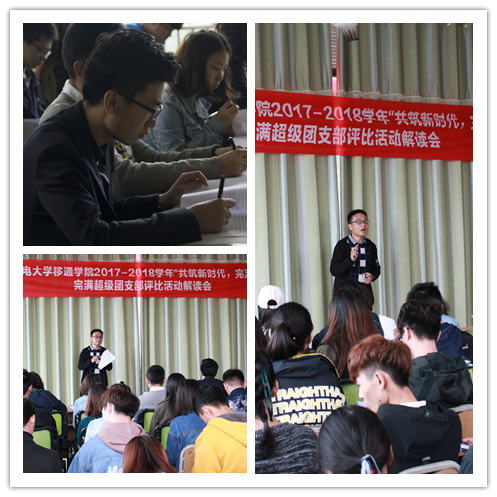 在解读会上,担任本次解读会主讲的第三届第二任团委组织部部长田斌,首先针对出席本次解读会的团支部书记代表提出问题:自开学以来,绝大部分团支部是否缺乏作为一个团队的凝聚力。该问题一经提出便得到了各位团支部书记代表的积极响应。田斌同学随即向团支部书记代表们了解支部日常活动开展难易度,并以此为契机向大家引出完满超级团支部评比活动的概念、目的及意义。他指出,在共青团改革的大背景下,我校面对全校开展“完满超级团支部”评比活动,旨在激发基层团组织活力,提升团支部的自身建设,建立特色团支部,提升支部成员的凝聚力,给予团支部一个展现自身风采的平台。