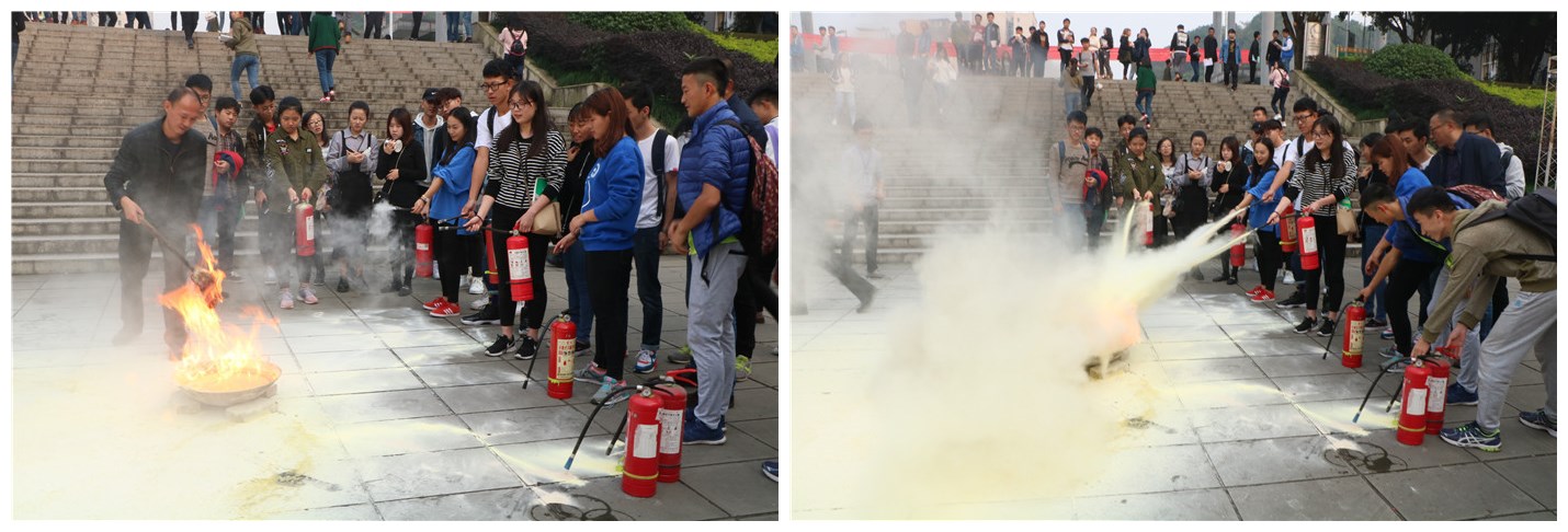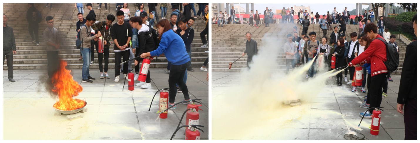下午3点40,教学楼广场上聚集了近200名学生,演练正式开始。“使用干粉灭火器灭火,应与起火位置保持3米以上距离,使用前,先把灭火器上下颠倒几次,然后拔下保险栓,一只手握住喷嘴,另一只手用力压下压把,对准火焰根部喷射……”保卫处郑好科长向同学们详细讲解了防火常识和灭火器的正确使用方法以及注意事项,在保卫处黄兵老师的现场演示和亲自指导下,部分学生踊跃参与,很快地掌握了正确使用灭火器的方法,迅速扑灭火源。