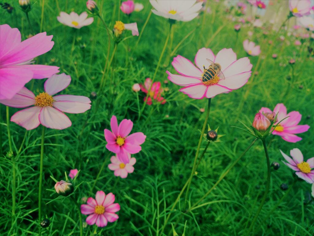 格桑花田中,微风吹拂,花儿轻轻摇曳,尽情展示着她们那优美的舞姿;阳光洒下她那柔色的光芒,映在花儿那美丽的脸庞上,肆意散发着迷人的微笑。这里,勤劳的蜜蜂们贪婪地汲取着甘甜的花蜜,美丽的蝴蝶在花丛中翩翩起舞,到处都充满了生机与活力。