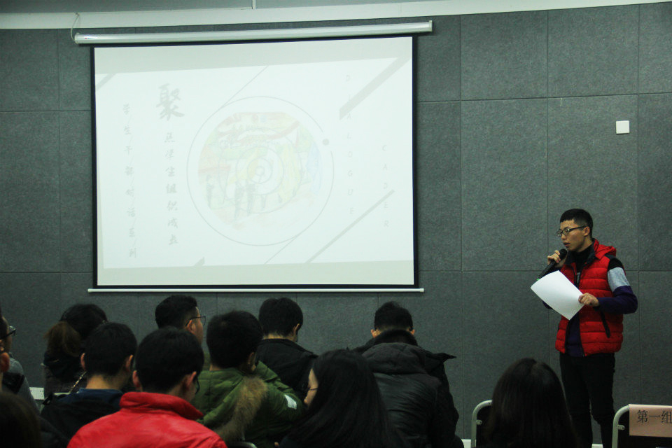 学生社团联合会主席张颖杰作为第二组的代表对组织文化建设、凝聚力等问题发表了看法,每一个组织、每一个部门都有自己的特色,我们应该根据各组织、部门的特色打造独特的文化,比如通过设置部歌、部徽、部训等打造“家”文化,让干部干事们有精神的寄托与情感的归属。