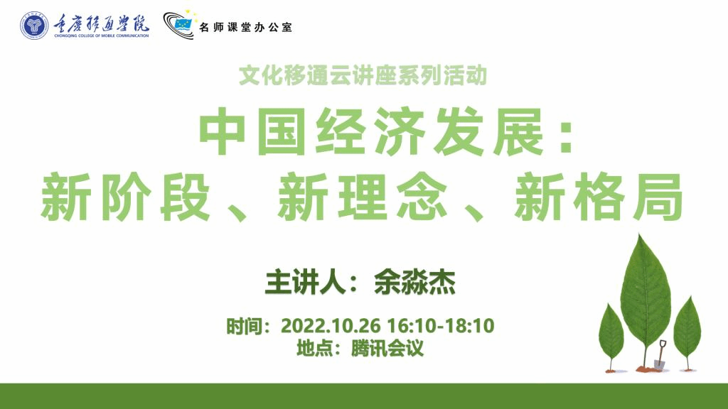 “青年强,则国家强,当代中国青年生逢其时,施展才干的舞台无比广阔,实现梦想的前景无比光明。”作为新时代青年,我们要勇担重任,在实现中华民族伟大复兴征程中贡献自己的青春力量。10月26日下午4点,文化移通线上研讨课为同学们带来了北京大学余淼杰教授关于中国经济发展:新阶段、新理念、新格局的精彩讲座,带领大家从宏观层面来理解当下和未来中国经济发展的关键词。